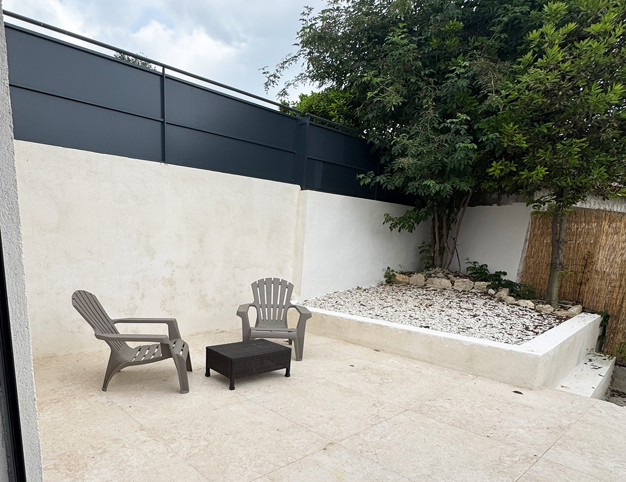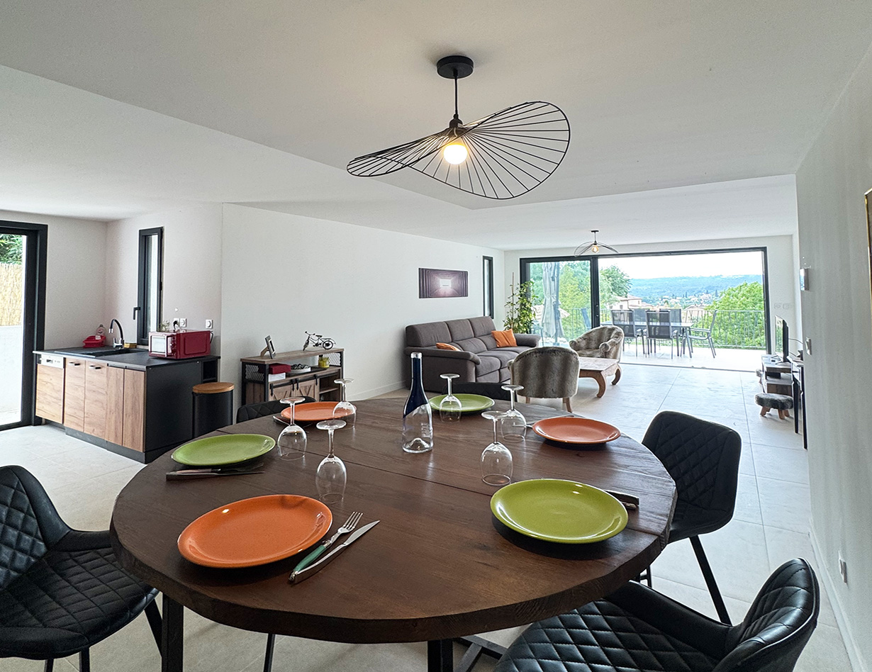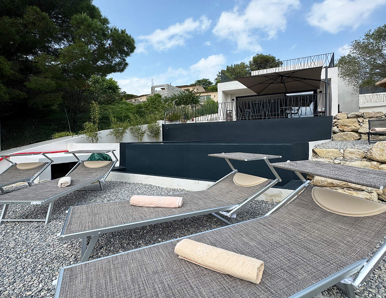 In front of the main living area, you’ll find a spacious terrace overlooking lush greenery. Additional terraces are located off the kitchen and in front of the upstairs master bedroom – the latter offering a particularly generous space with stunning views. The garden includes a small but elegant modern pool with comfortable sun loungers, as well as a pétanque (boules) court. A ping-pong table will also be available in the garden from summer.
