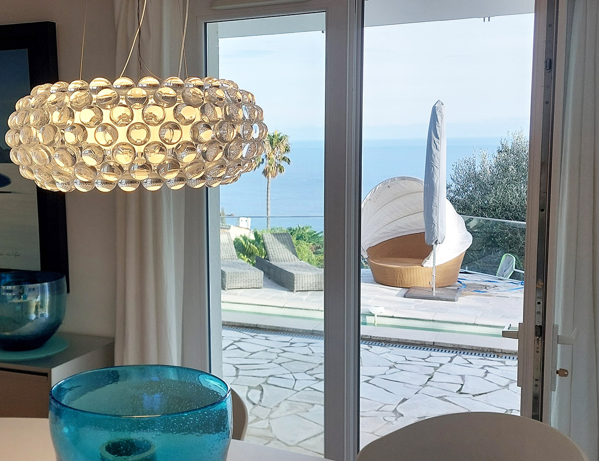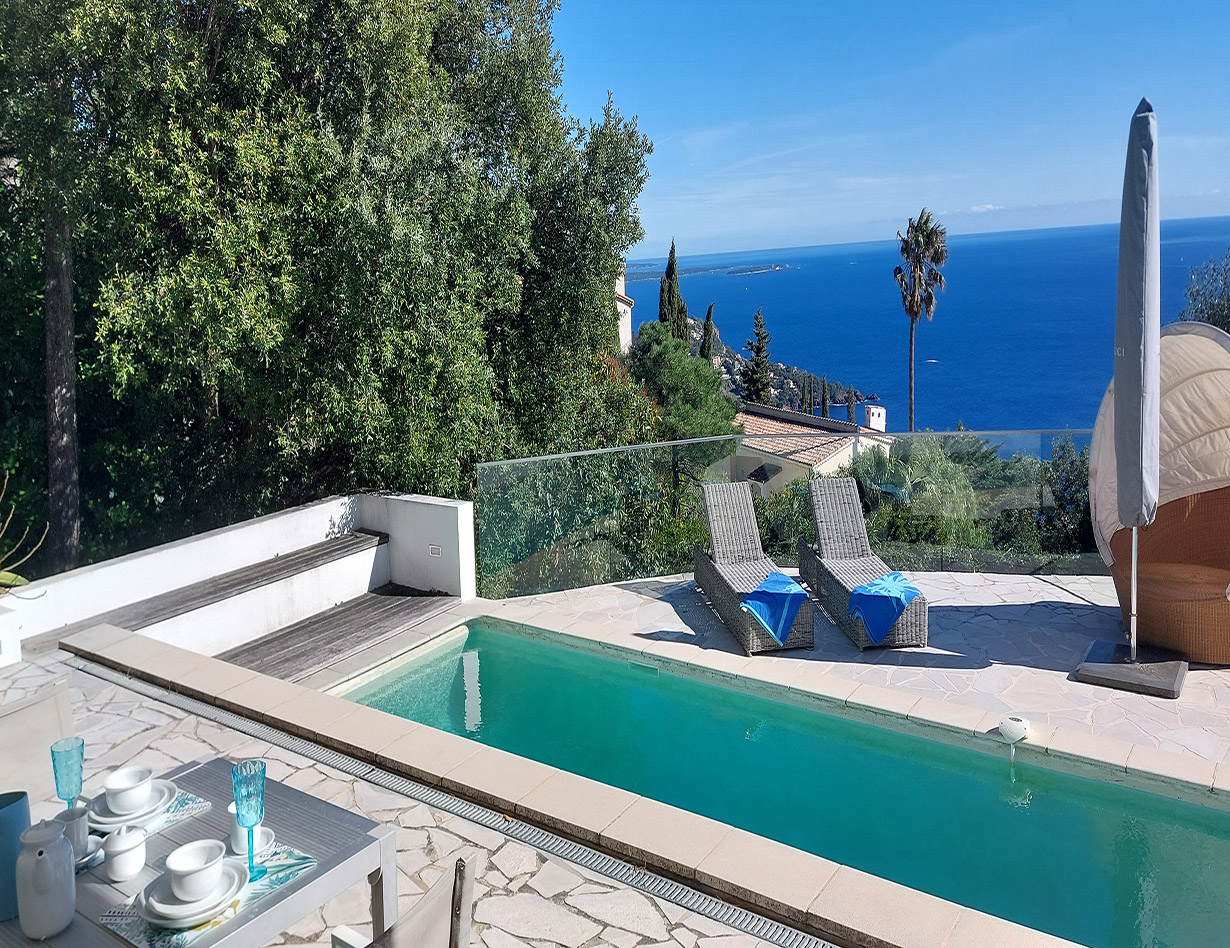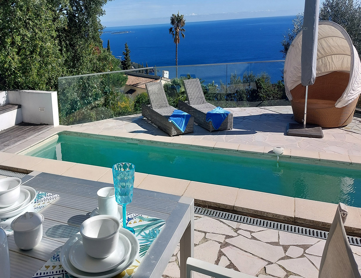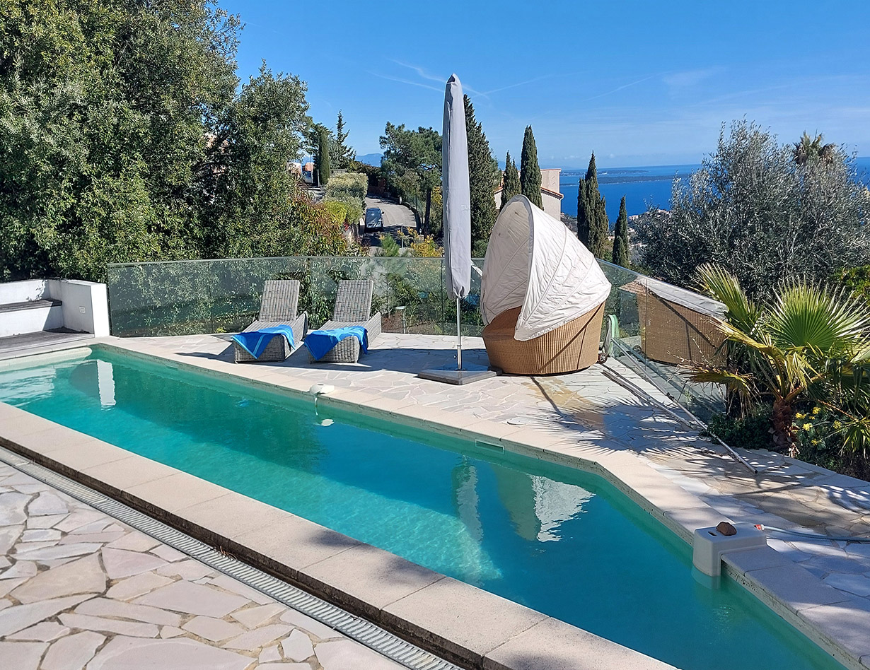 In einer luxuriösen geschlossen Domain, in einer Sackgasse, ruhig. Herrlicher Blick zum Meer. Nach Nizza ca 40 Minuten, Cannes ca 15-20 Minuten, Strände ca. 10 min.