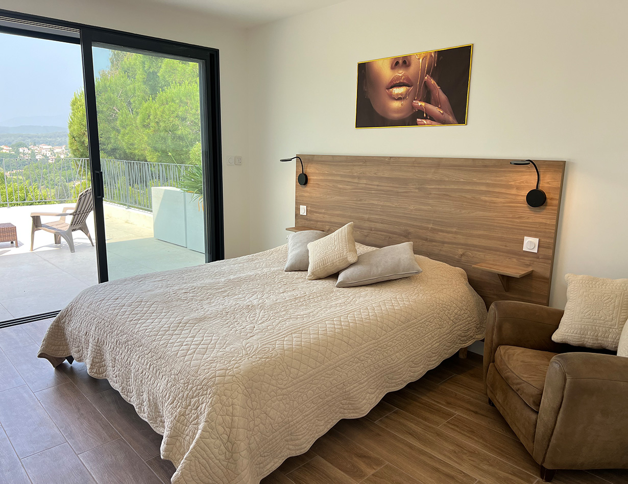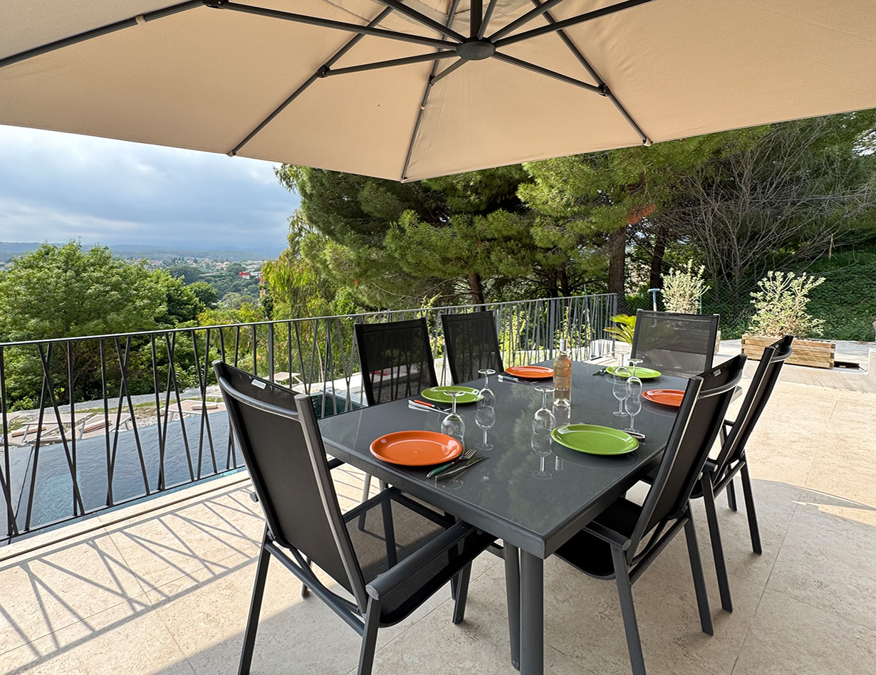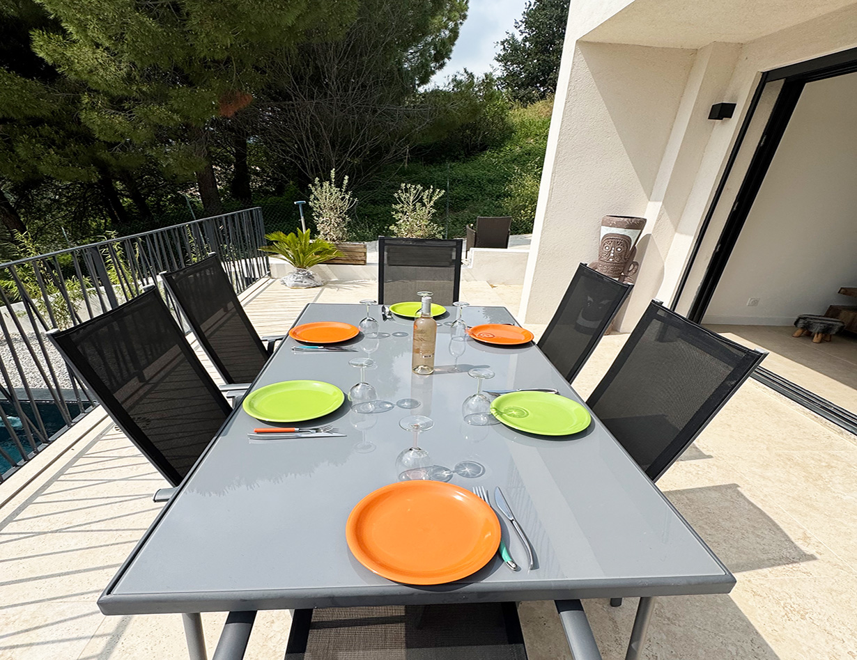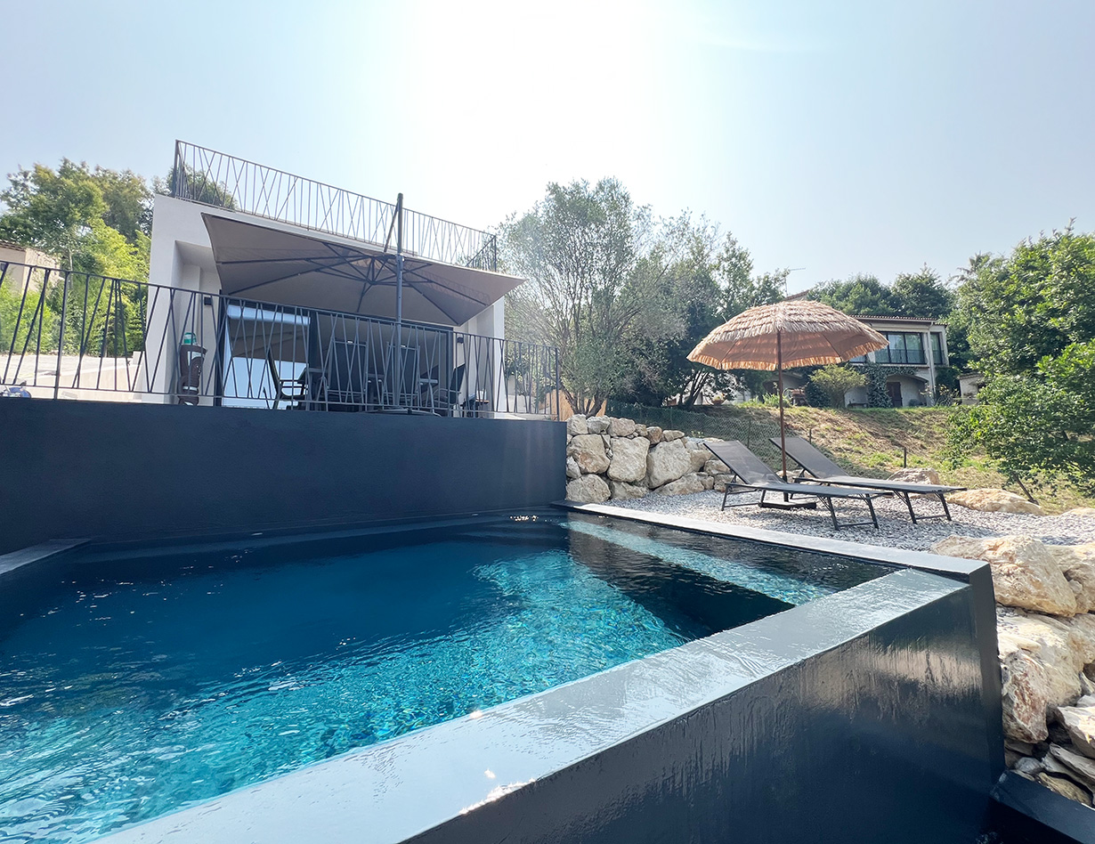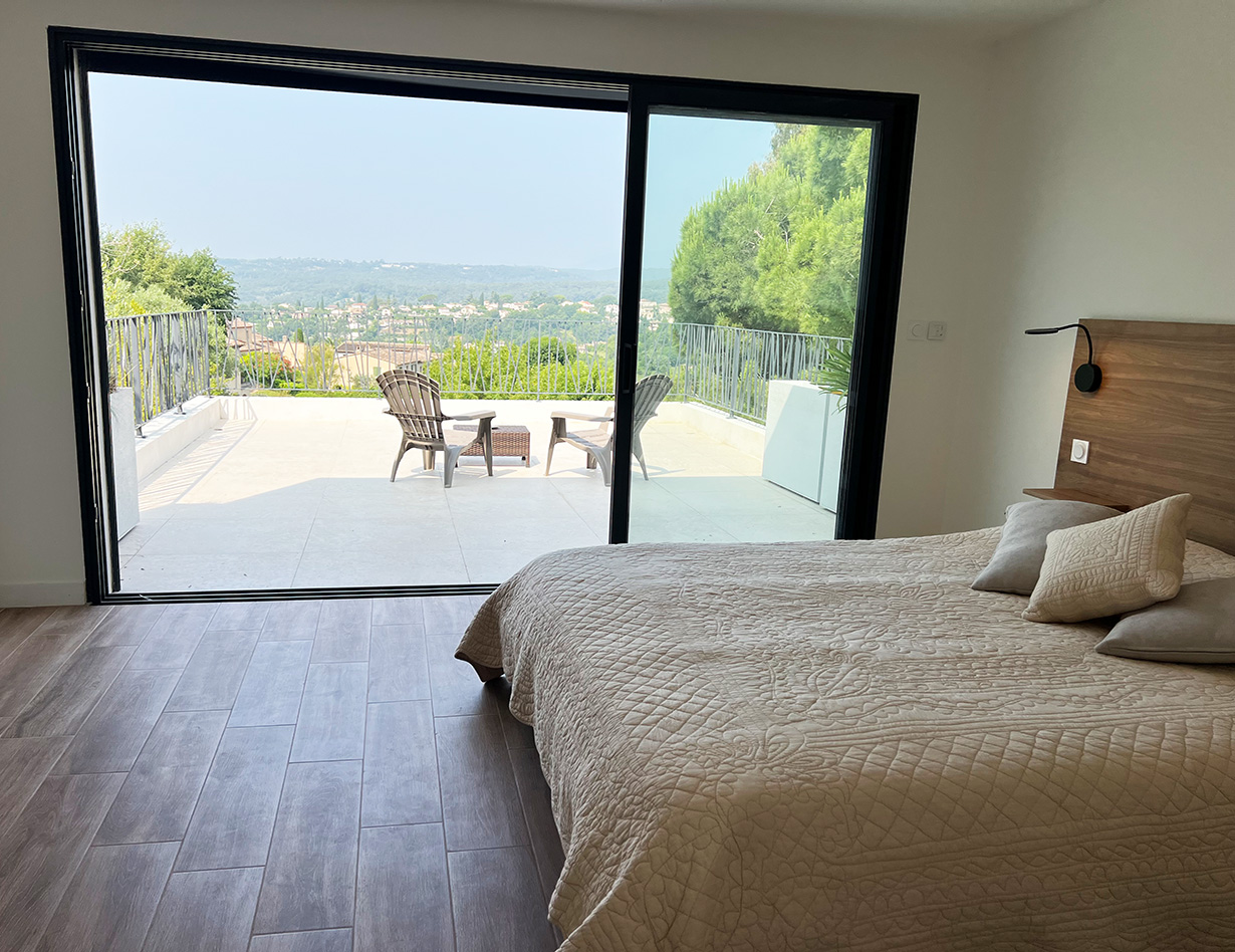 St Paul-de-Vence: Gerade ganz neu gebaute moderne Villa in ruhiger Lage mit 3 sehr schönen klimatisierten Schlafzimmern mit Doppelbetten und ensuite Bädern. Das schöne gepflegte Ferienhaus verfügt über einen offenen Wohn-Eßbereich mit Wohnküche und gemütlichen Sofas, TV. Vor der Wohnebene haben Sie eine schöne große Terrasse mit Blick in die Natur. Weitere Terrassen befinden sich vor der Küche und eine super große Terrasse mit tollem Blick vor dem Masterbedroom im OG. Im Garten befindet sich ein kleiner, aber sehr feiner moderner Pool mit komfortablen Sonnenliegen und Schirmen. Bouleplatz. Ab Sommer Tischtennisplatte im Garten. Das Haus ist ideal mit Erwachsenen oder mit Teenagern, drei Paare haben auch drei gleichwertige schöne Zimmer. Voll klimatisiert. Kleine Kinder sind nicht gewünscht, da das Grundstück und auch innen die Treppe nicht geeignet für ganz kleine Kinder sind. Parken auf dem Grundstück. Das Grundstück ist teilweise gezäunt. Pool nicht einsehbar.
