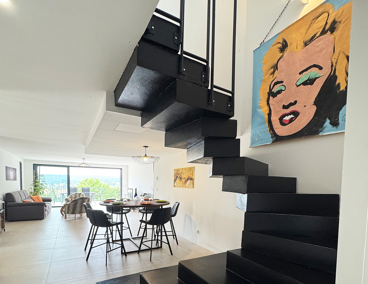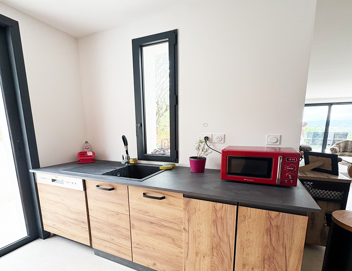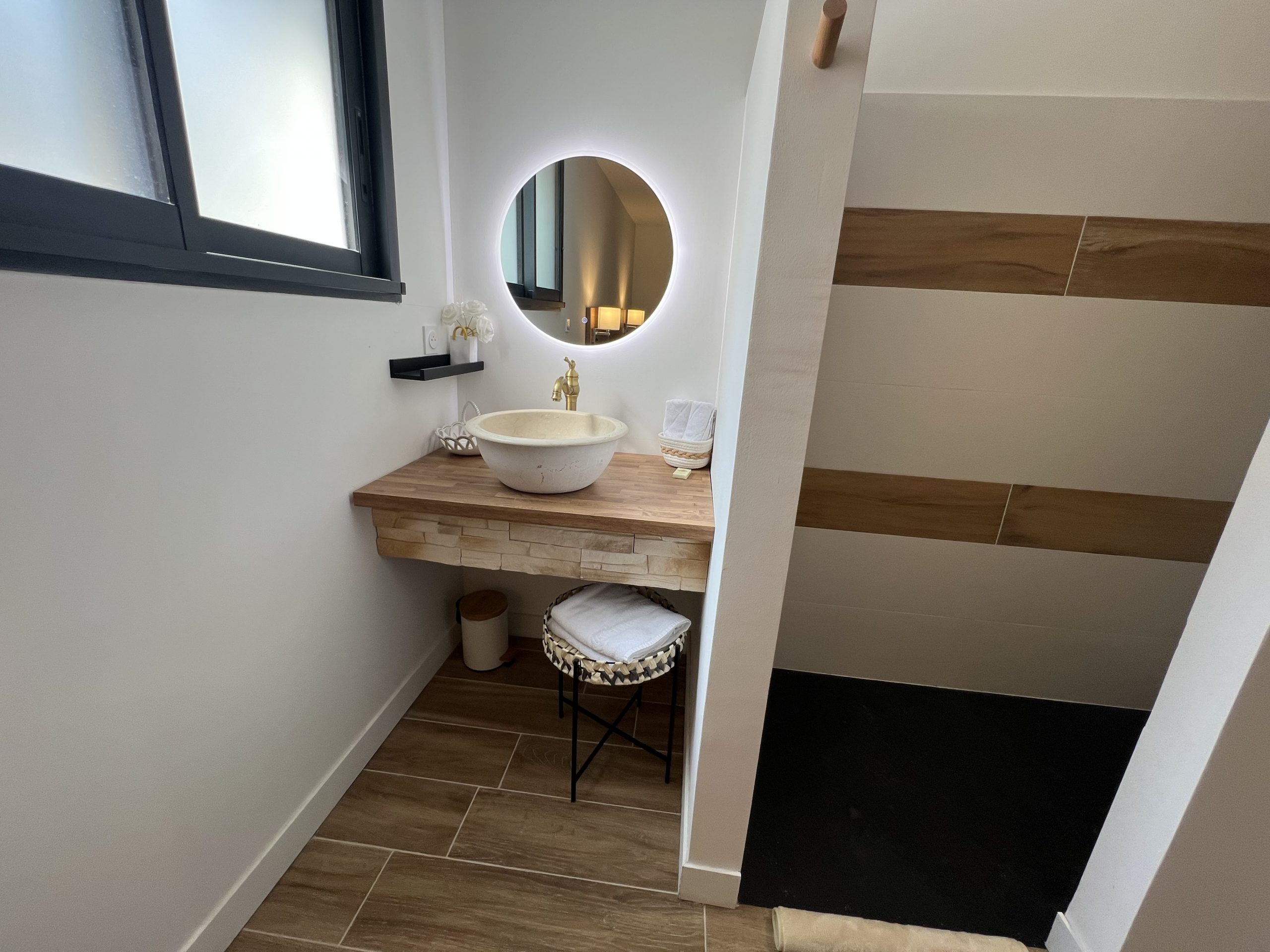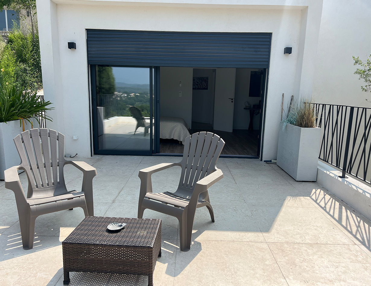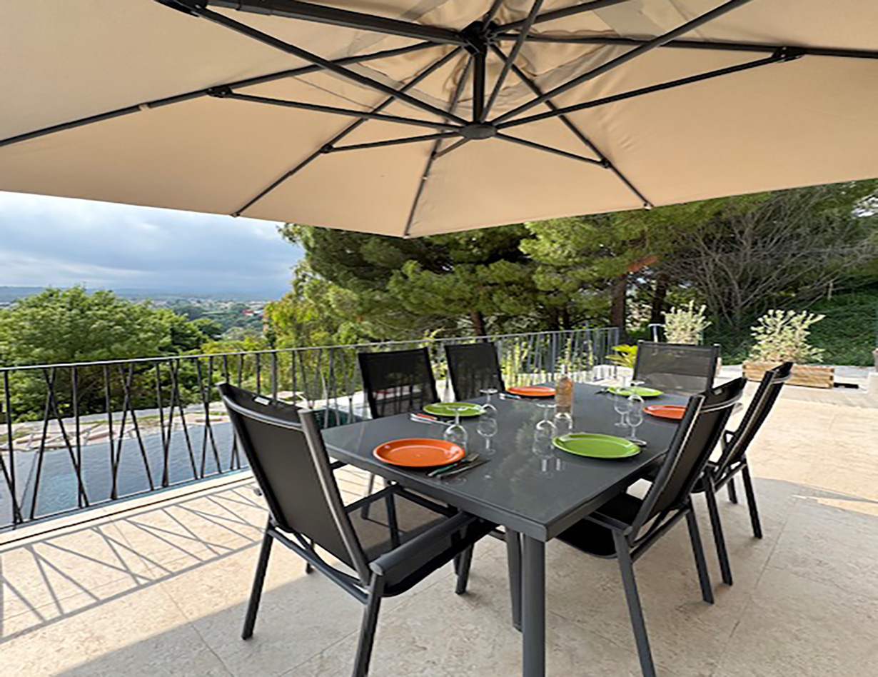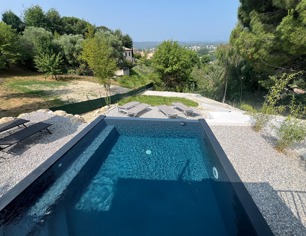St Paul-de-Vence: Gerade ganz neu gebaute moderne Villa in ruhiger Lage mit 3 sehr schönen klimatisierten Schlafzimmern mit Doppelbetten und ensuite Bädern. Das schöne gepflegte Ferienhaus verfügt über einen offenen Wohn-Eßbereich mit Wohnküche und gemütlichen Sofas, TV. Vor der Wohnebene haben Sie eine schöne große Terrasse mit Blick in die Natur. Weitere Terrassen befinden sich vor der Küche und eine super große Terrasse mit tollem Blick vor dem Masterbedroom im OG. Im Garten befindet sich ein kleiner, aber sehr feiner moderner Pool mit komfortablen Sonnenliegen und Schirmen. Bouleplatz. Ab Sommer Tischtennisplatte im Garten. Das Haus ist ideal mit Erwachsenen oder mit Teenagern, drei Paare haben auch drei gleichwertige schöne Zimmer. Voll klimatisiert. Kleine Kinder sind nicht gewünscht, da das Grundstück und auch innen die Treppe nicht geeignet für ganz kleine Kinder sind. Parken auf dem Grundstück. Das Grundstück ist teilweise gezäunt. Pool nicht einsehbar.