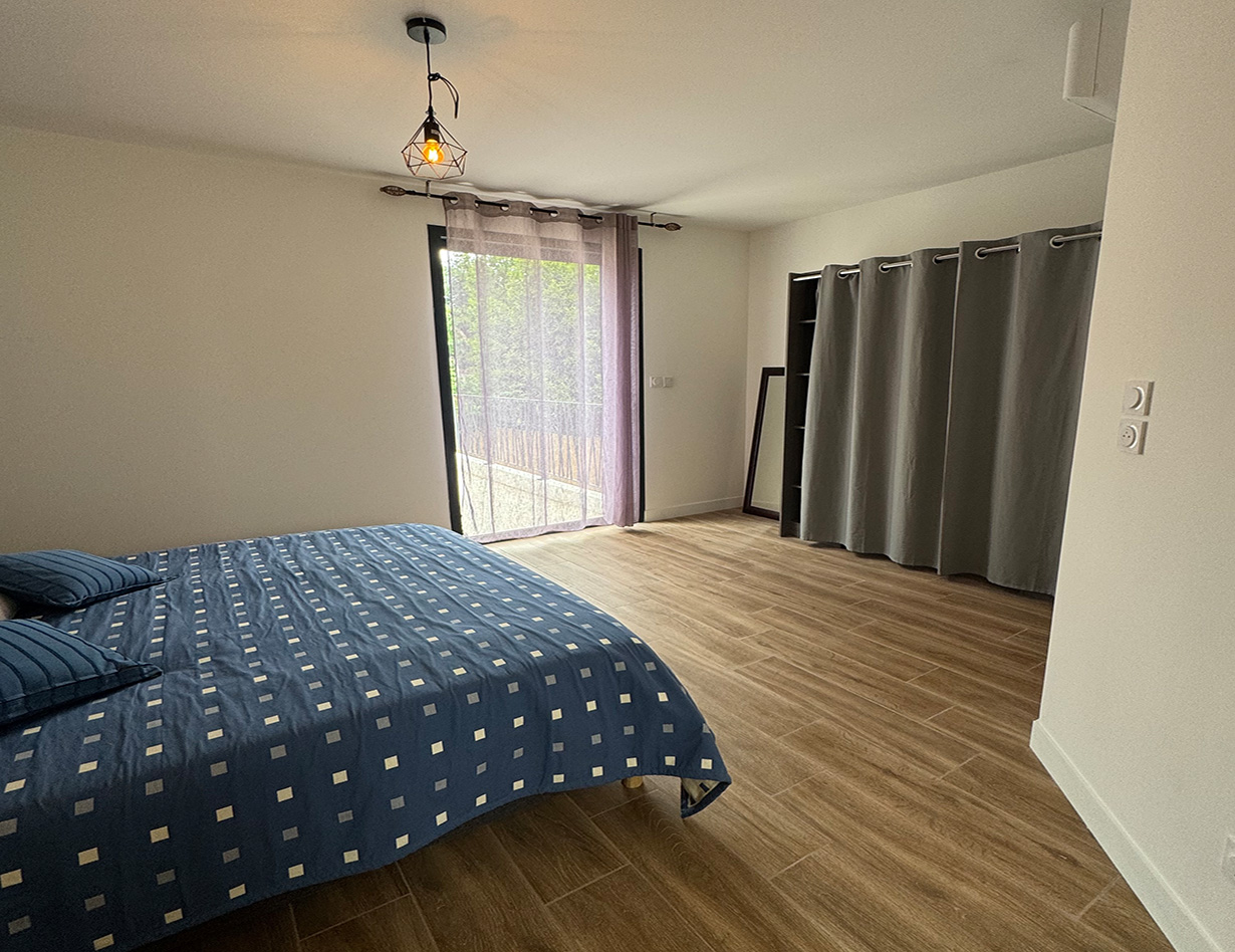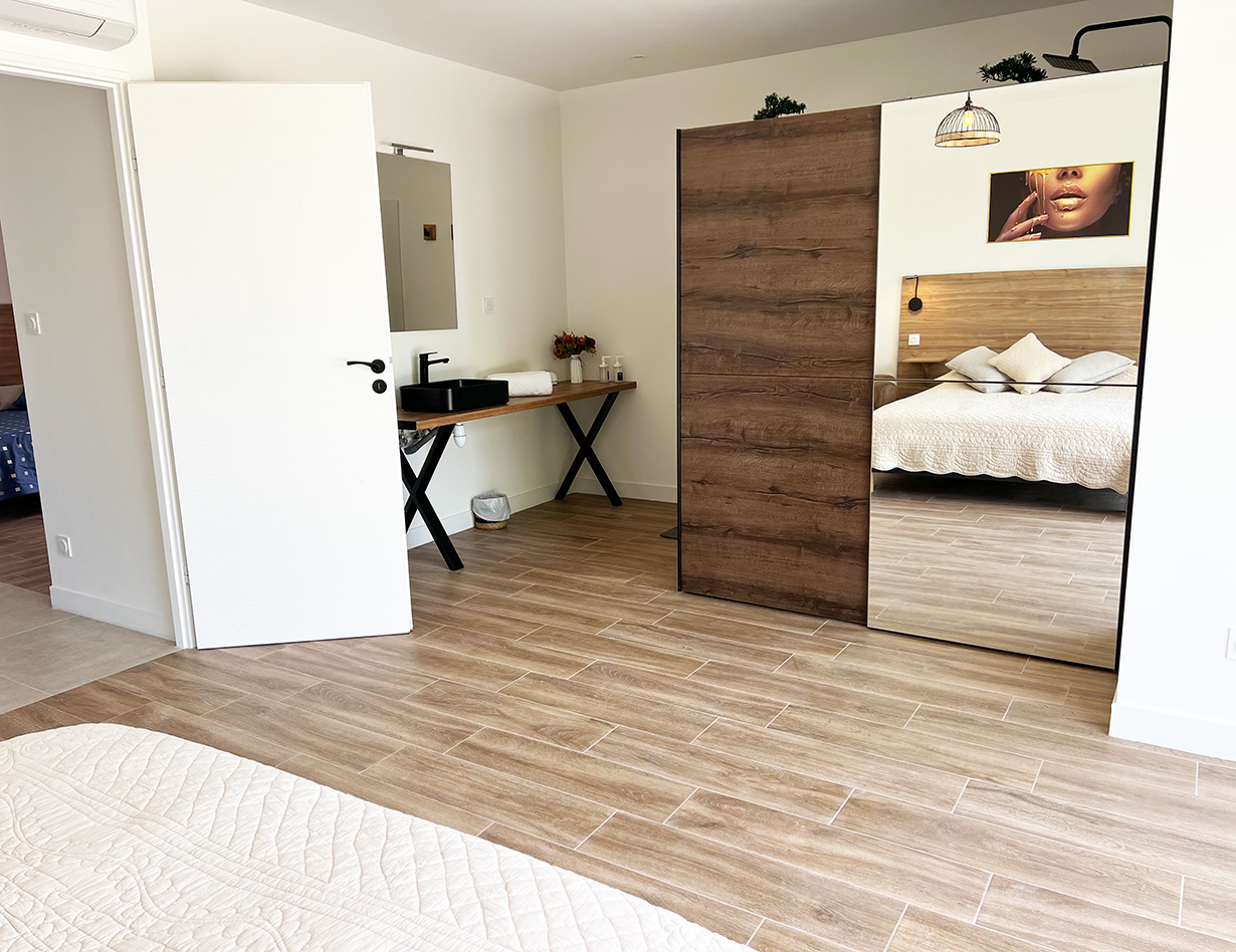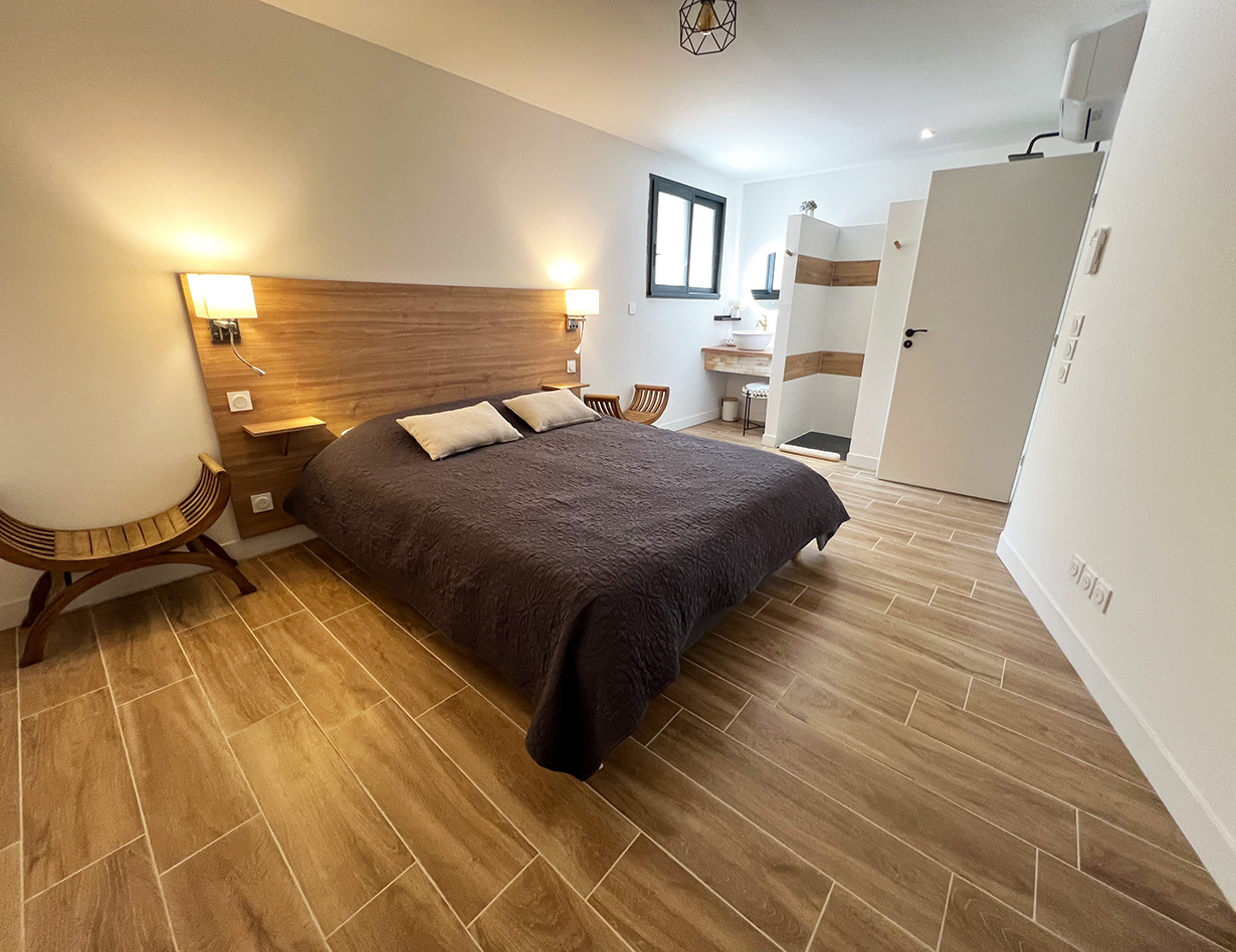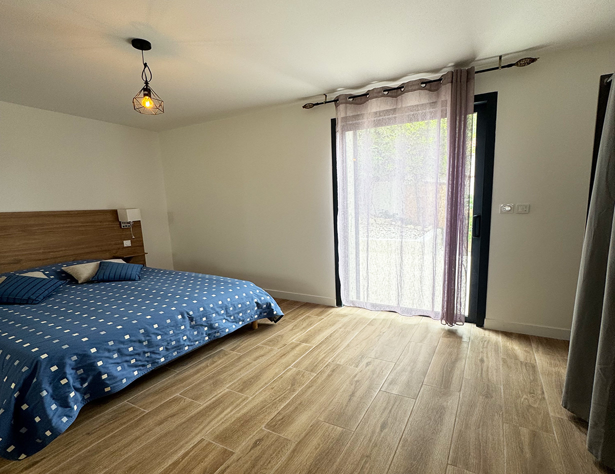 Schlafzimmer 2: EG – Großes Zimmer mit großem Doppelbett und ensuite Badezimmer. AC