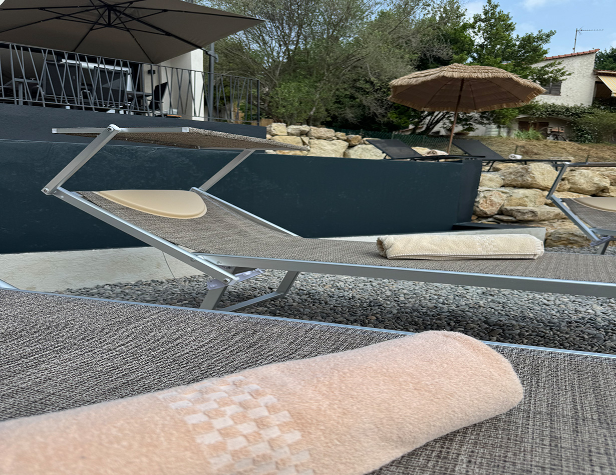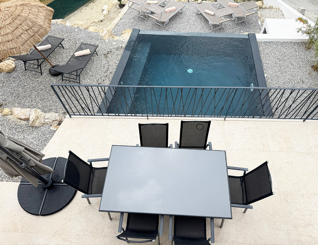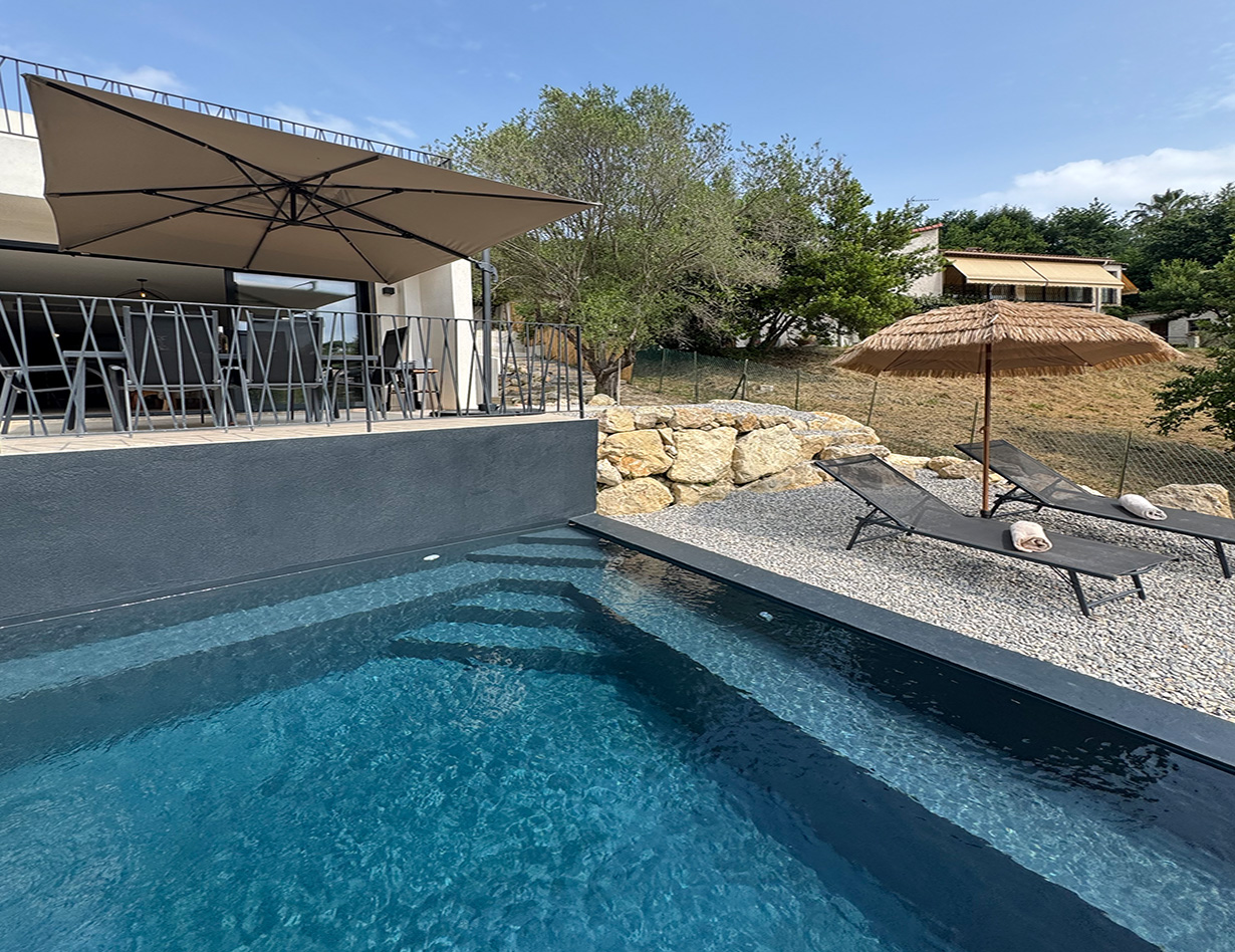 Privater Pool ca 4×4 m, mit komfortablen Sonnenliegen, Sonnenschirme