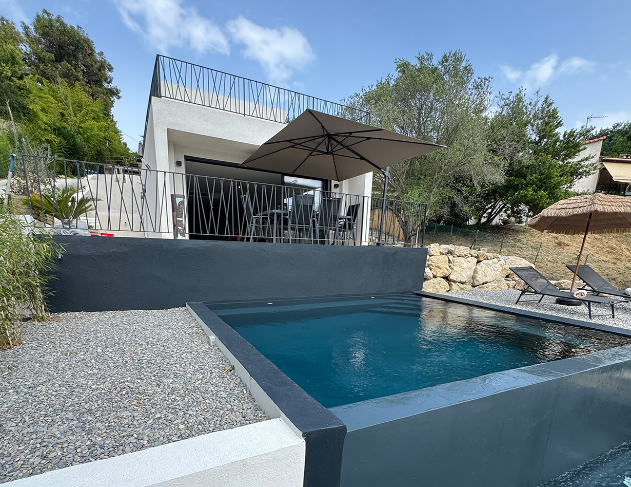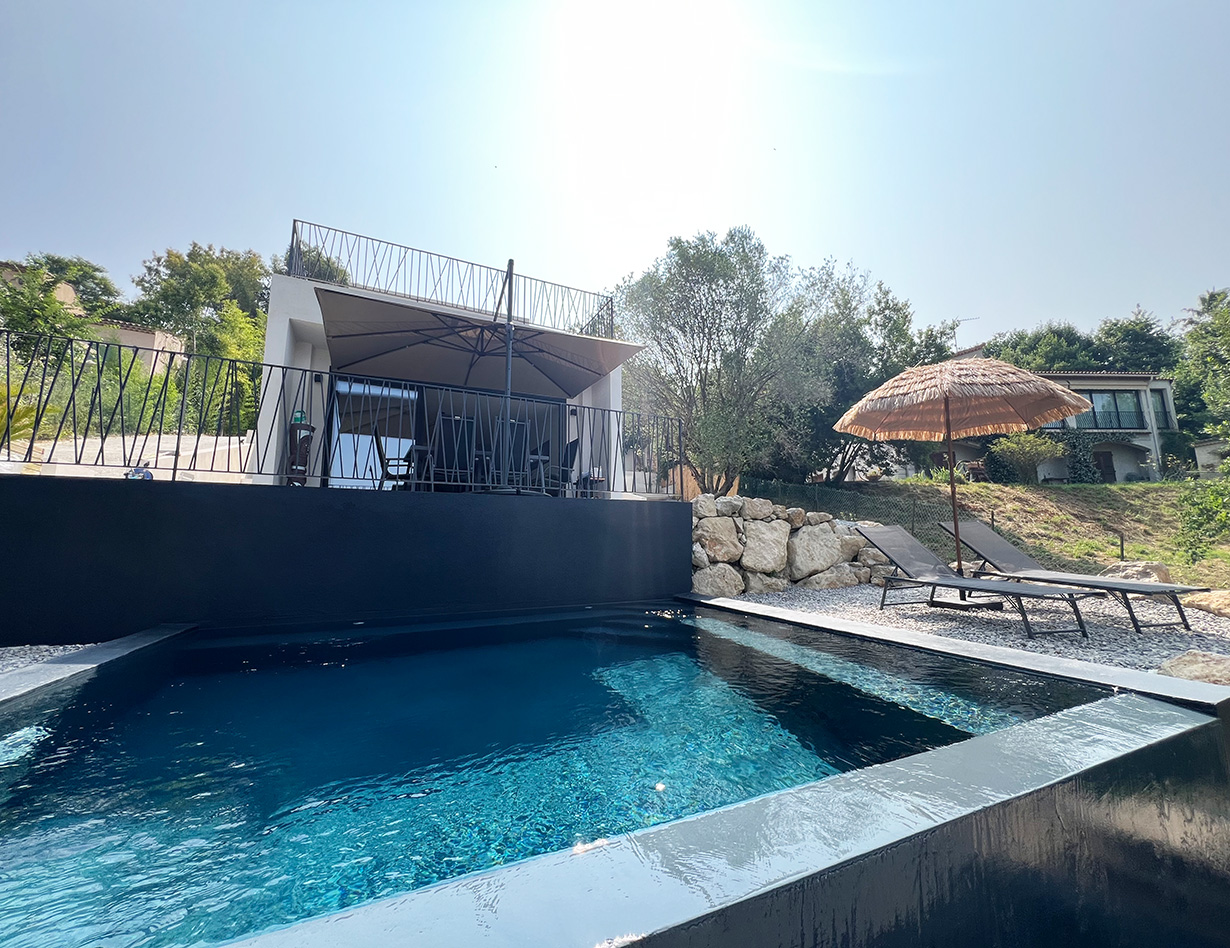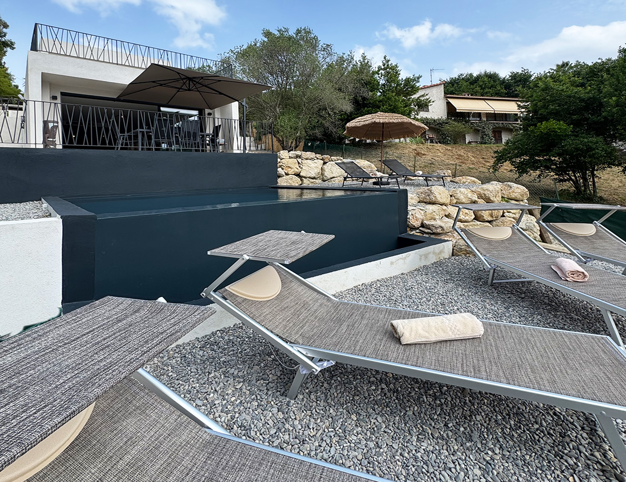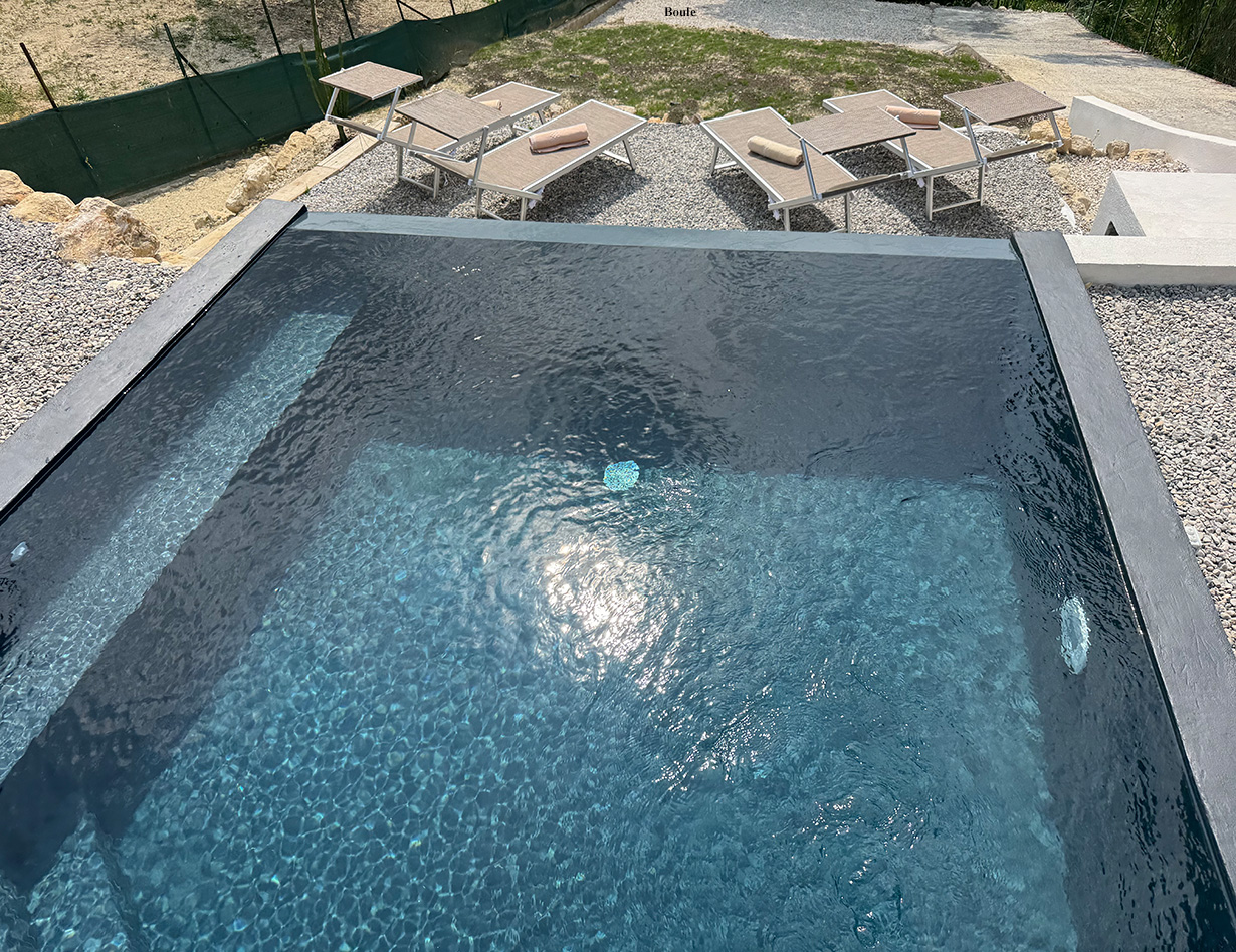 Privater Pool ca 4×4 m, mit komfortablen Sonnenliegen, Sonnenschirme
