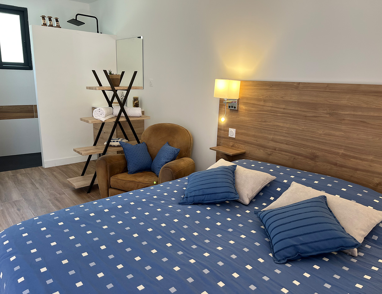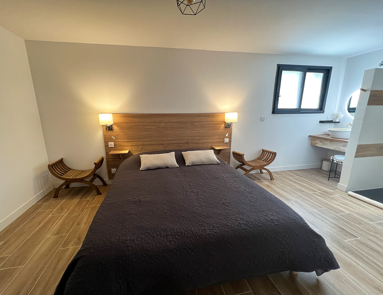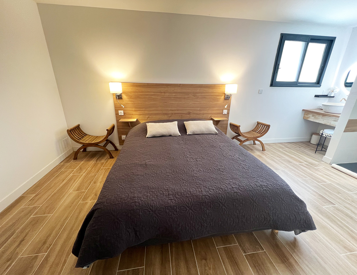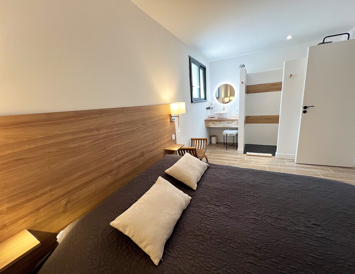 Schlafzimmer 3: EG – Großes Zimmer mit großem Doppelbett und ensuite Badezimmer. AC
