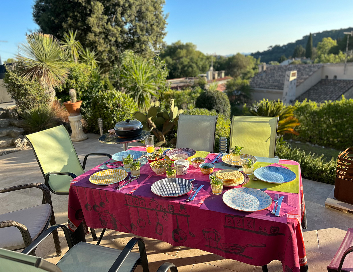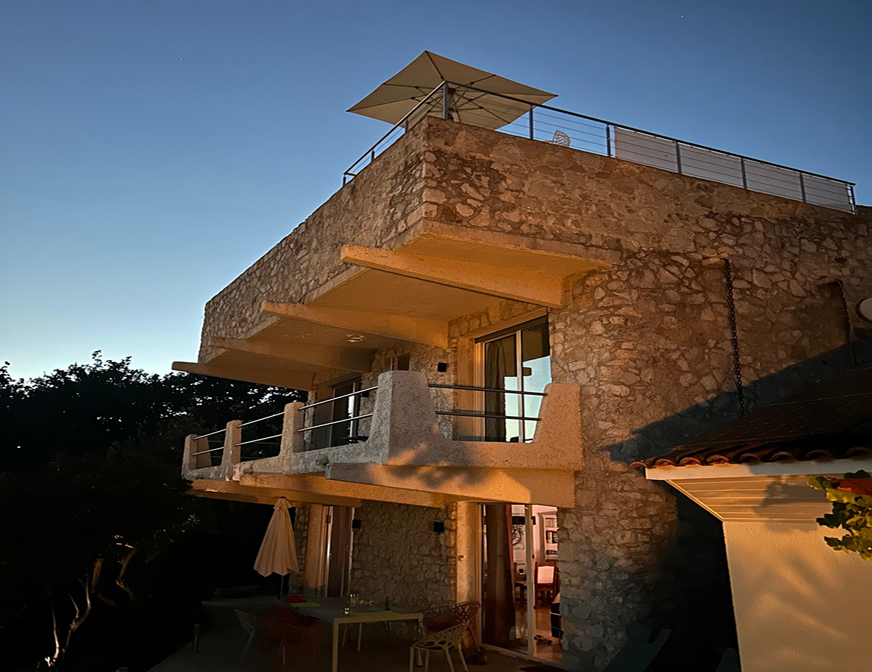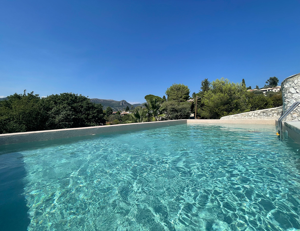Schönes renoviertes Natursteinhaus in südlicher Lage vom berühmtem Künstlerort Vence liegt in einer Sackgasse. Das gepflegte freundliche und sehr gut ausgestattete Ferienhaus verfügt über 3 sehr schöne Schlafzimmer (davon ein sehr großes tolles Masterzimmer mit ensuite Bad und herrlichem Blick), 3 Badezimmer, 3 WCs. Sehr großes Wohnzimmer mit gemütlichen Sofas, großem Eßtisch, sehr großes TV. Austritt vom Wohnzimmer auf die wunderbare Terrasse von der Sie einen schönen Blick auf die Umgebung haben.. Komfortable und sehr gut ausgestattete Küche, BBQ auf der Terrasse. Über eine Wendeltreppe erreicht man den coolen und schön großen Roof-Top-Pool von 13×5 m Pool: tolle Dachterrasse mit komfortablen Sonnenliegen. Von dort oben genießt man einen 360°- Blick mit einem „Aperçu mer“, Alpes Maritimes, dem Esterel- Gebirge und Saint Paul de Vence, einem romantisches Künstlerstädtchen und natürlich einen tollen Blick in den herrlich angelegten mediterranen Garten mit Zitrusbäumchen, Feigen, Lavendel, Rosmarin u. v.m. , Petanque-Platz. Nette BBQ-Lounge-Ecke. Deutsches TV. Sonos. Parkplatz auf privatem Grundstück, es sind Parkplätze für 2-3 PKW vorhanden. Ein sehr schönes Ferienhaus für die Familie oder mit Freunden. Für ganz kleine Kinder oder gehbehinderte Gäste nicht geeignet, Wendeltreppe zum Pool ist etwas steil.