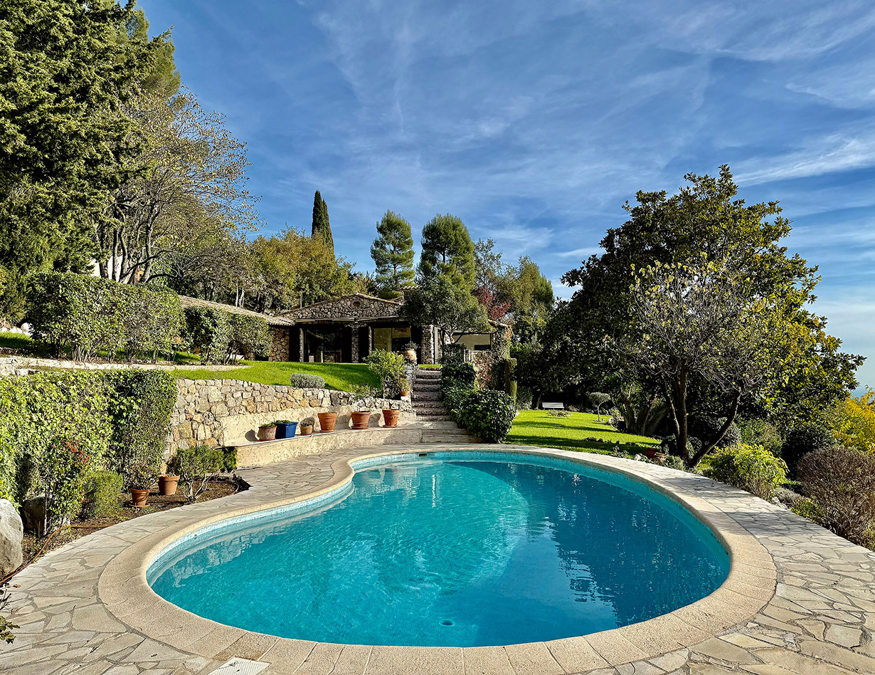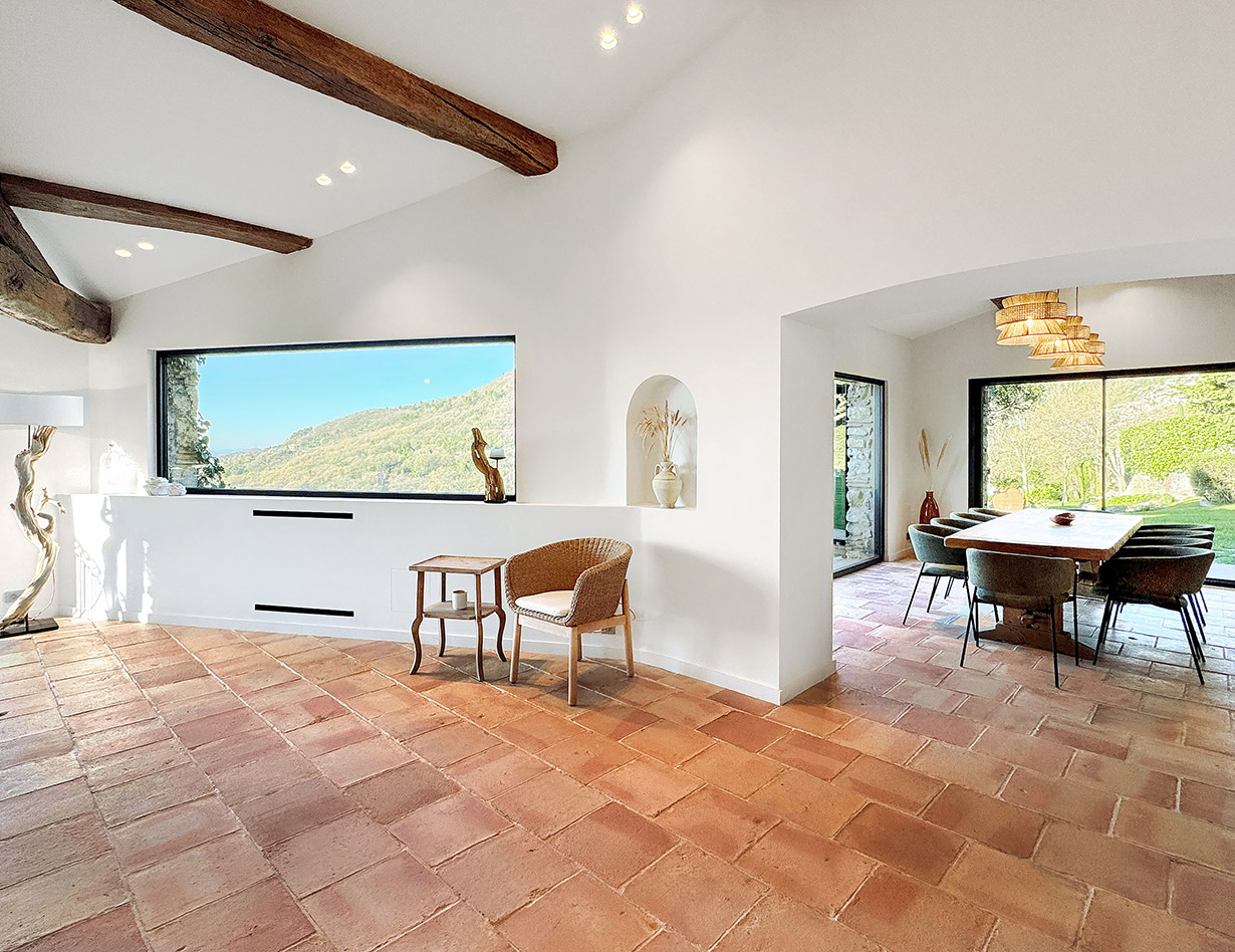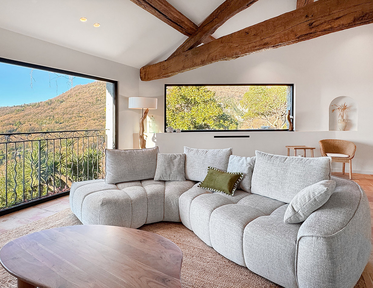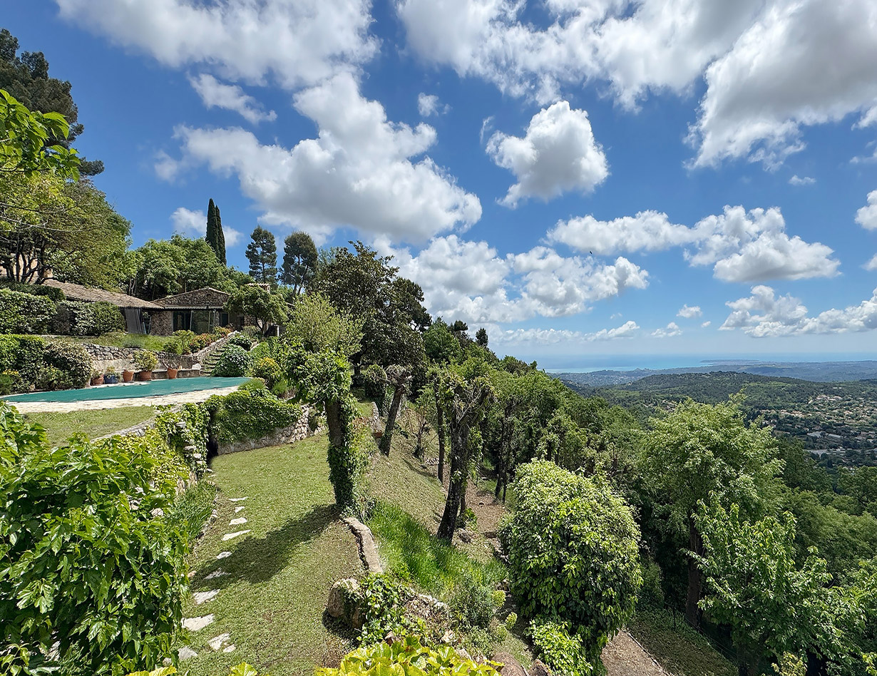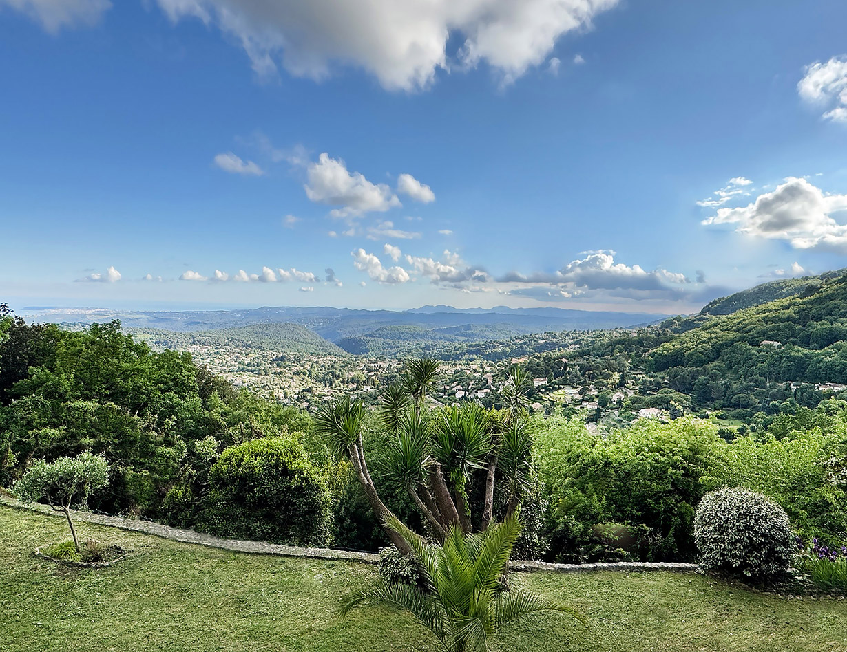 Die edle Villa empfängt 10 bis 12 Gäste in großzügigen, harmonisch gestalteten Räumen, die sofort ein Gefühl von Leichtigkeit und Geborgenheit vermitteln. Weite Ausblicke öffnen sich über das grüne Tal bis hin zum Meer Richtung Antibes – ein Panorama, das zu jeder Tageszeit fasziniert und eine besondere Atmosphäre der Gelassenheit schafft.