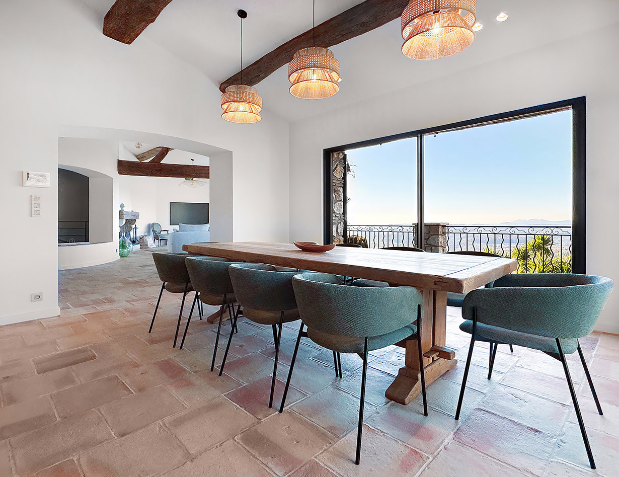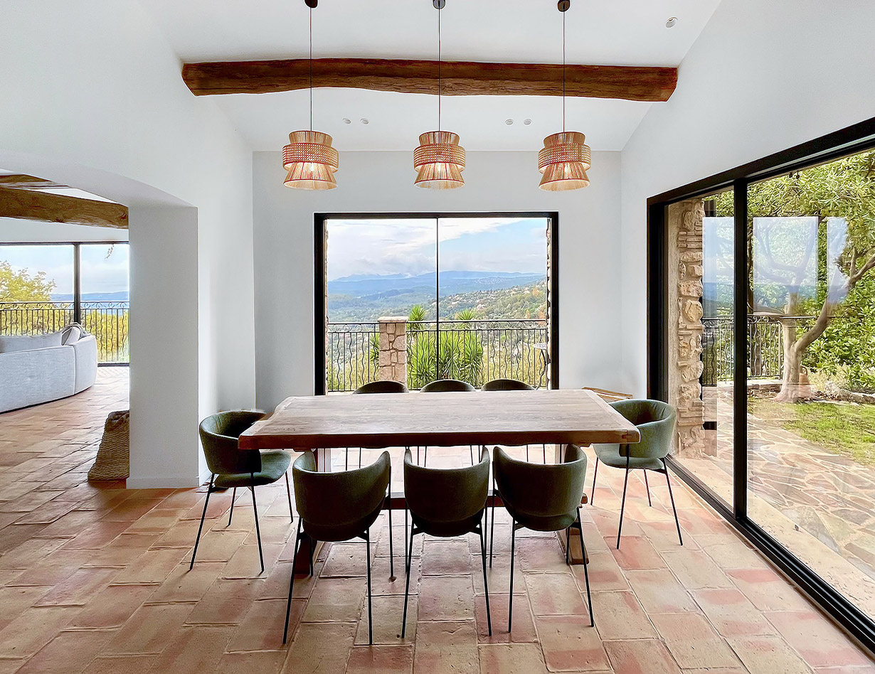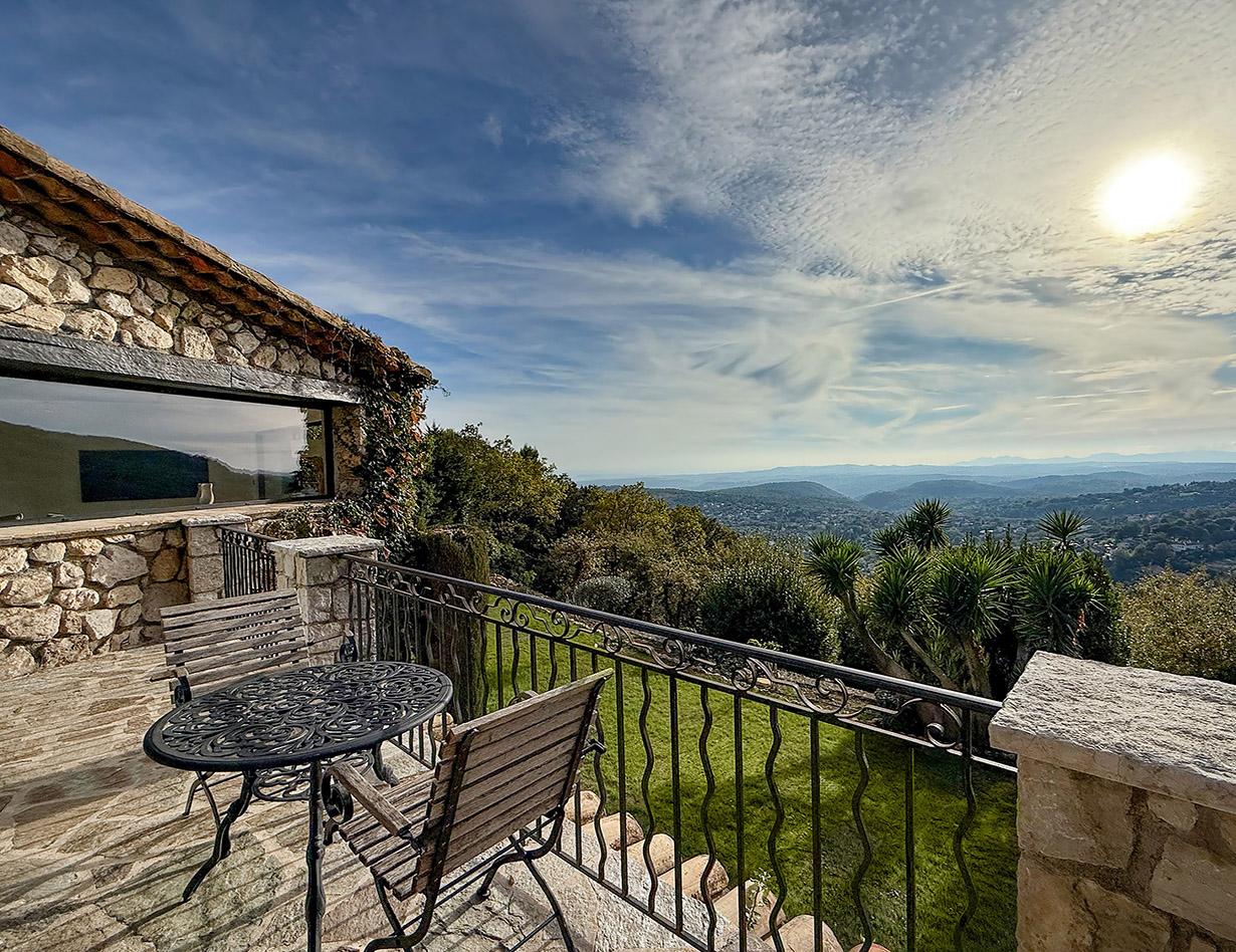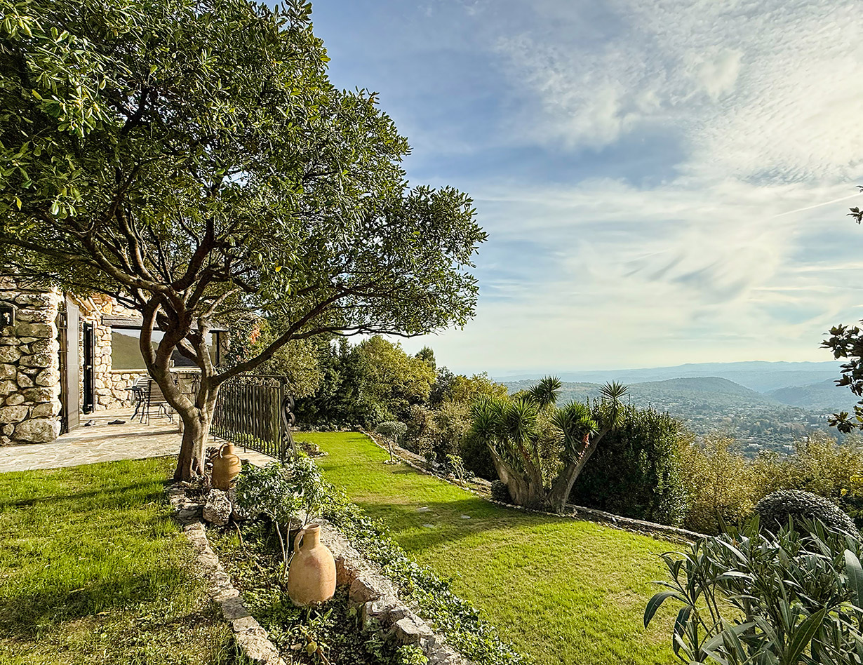 Die edle Villa empfängt 10 bis 12 Gäste in großzügigen, harmonisch gestalteten Räumen, die sofort ein Gefühl von Leichtigkeit und Geborgenheit vermitteln. Weite Ausblicke öffnen sich über das grüne Tal bis hin zum Meer Richtung Antibes – ein Panorama, das zu jeder Tageszeit fasziniert und eine besondere Atmosphäre der Gelassenheit schafft.