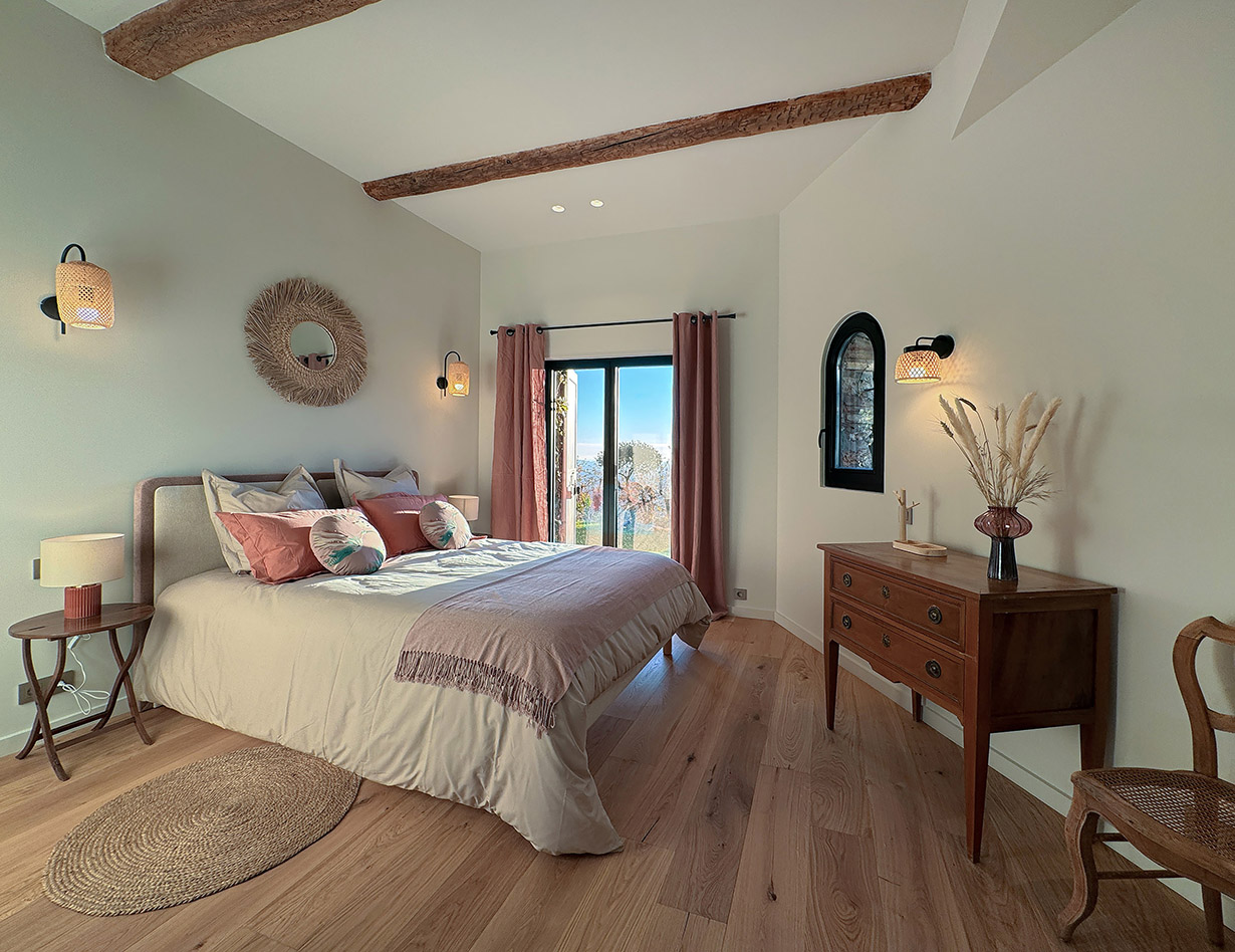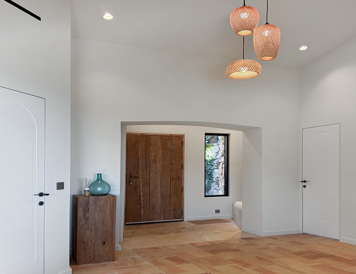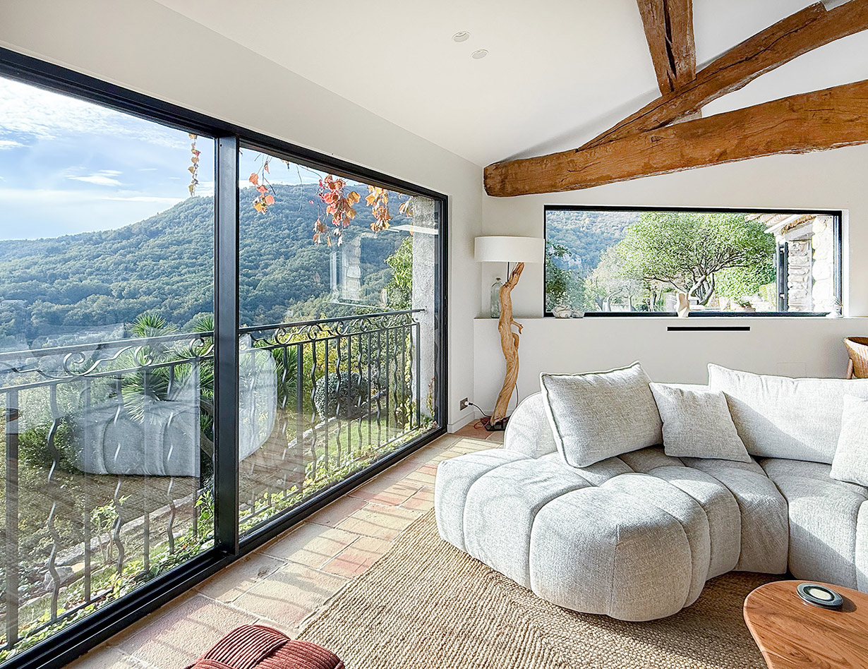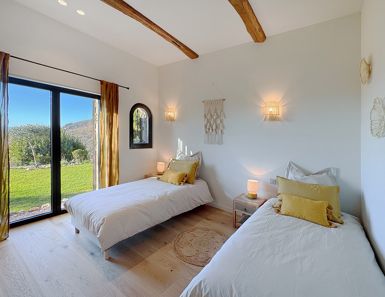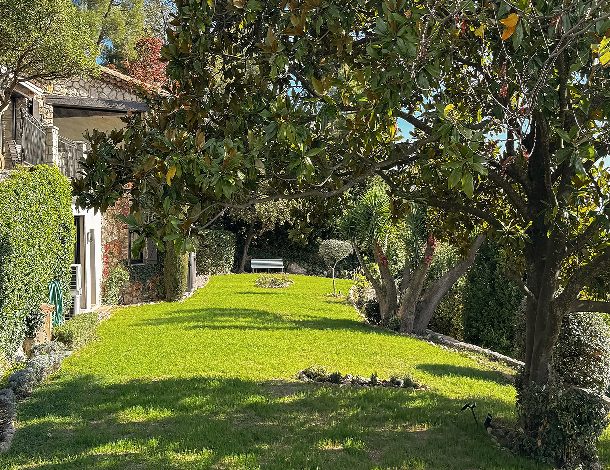 Die edle Villa empfängt 10 bis 12 Gäste in großzügigen, harmonisch gestalteten Räumen, die sofort ein Gefühl von Leichtigkeit und Geborgenheit vermitteln. Weite Ausblicke öffnen sich über das grüne Tal bis hin zum Meer Richtung Antibes – ein Panorama, das zu jeder Tageszeit fasziniert und eine besondere Atmosphäre der Gelassenheit schafft.
