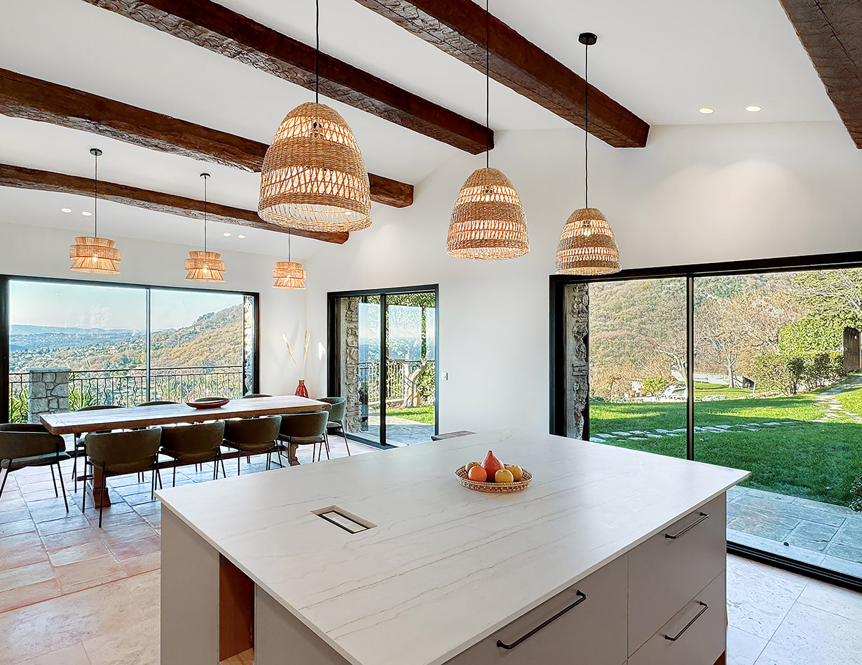Das Hauptgeschoss bildet das Herz des Hauses: Ein elegantes, lichtdurchflutetes Wohnzimmer mit offenem Kamin und großformatigen Boden-Fenstern rahmt die Aussicht wie ein lebendiges Gemälde. Die offene exklusive Küche mit angrenzendem Essbereich ist hochwertig ausgestattet, verfügt über modernste Geräte, einen zentralen Küchenblock sowie einen Weinkühlschrank – perfekt für genussvolle Abende in stilvollem Ambiente. Und ein Genuss für alle, die gerne kochen!