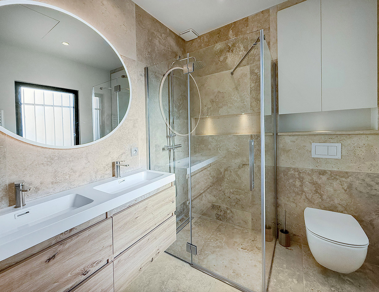 5 SZ alle mit Bädern und Klimaanlage. Es können zwei Schlafzimmer sowohl als Doppelbett, wie auch als Einzelbetten vorbereitet werden.