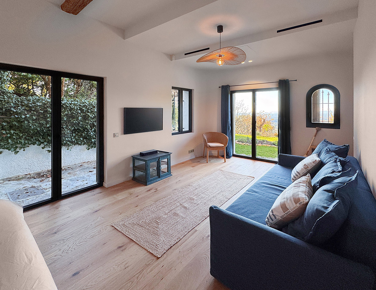Gemütlicher offener Wohnbereich, sehr schön eingerichtet. Toll die riesigen Fenster, die man im Sommer auch ganz aufschieben kann. Leben innen und außen!