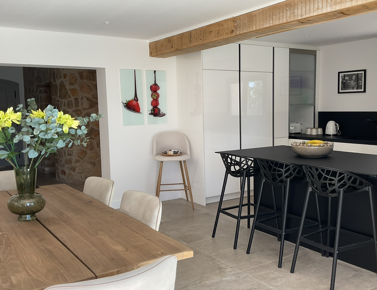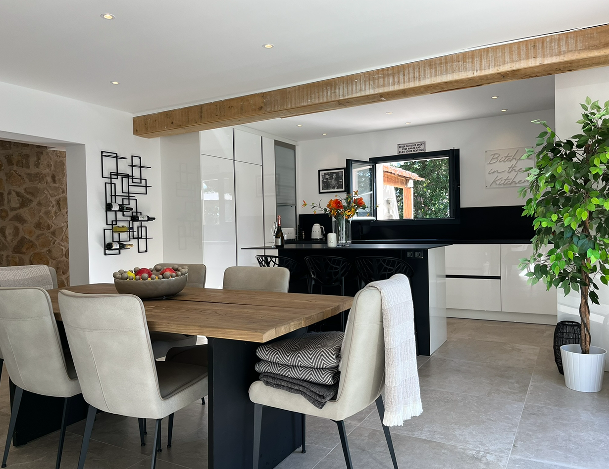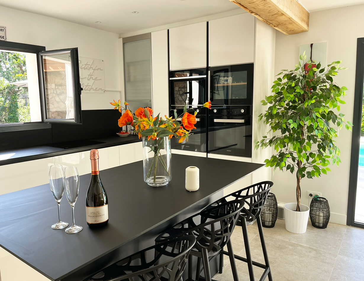 - Stylish, modern, very well-equipped kitchen with a large central island and bar. Covered terrace in front of the kitchen with large outdoor dining table. Large indoor dining table as well. Nespresso machine.