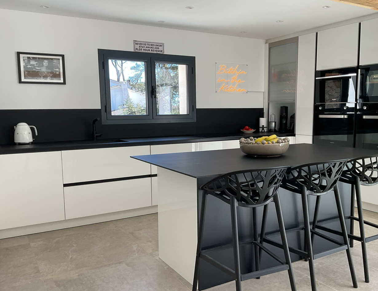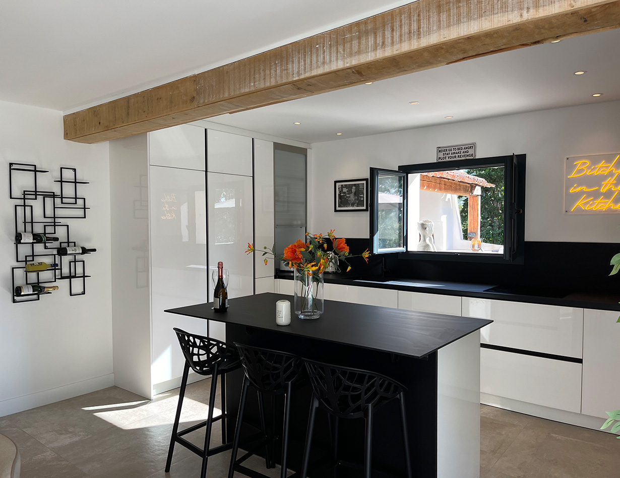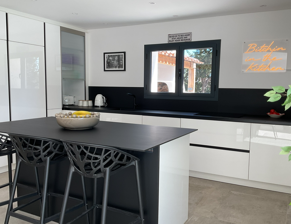 - Stylish, modern, very well-equipped kitchen with a large central island and bar. Covered terrace in front of the kitchen with large outdoor dining table. Large indoor dining table as well. Nespresso machine.