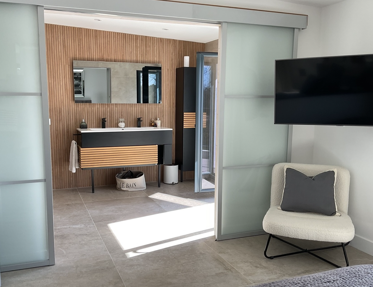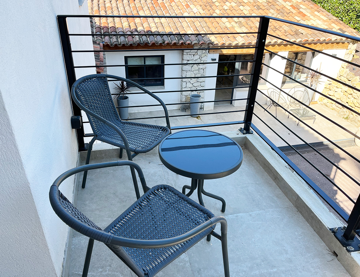 The highlight of the property is the very large (heated on request) swimming pool with a pool shower and comfortable sun loungers – a true oasis under the southern French sun. Enjoy sociable evenings at the large dining tables indoors or outdoors, or relax on the covered terrace with its beautiful natural stone wall, built-in BBQ/Plancha, and cozy lounge atmosphere.