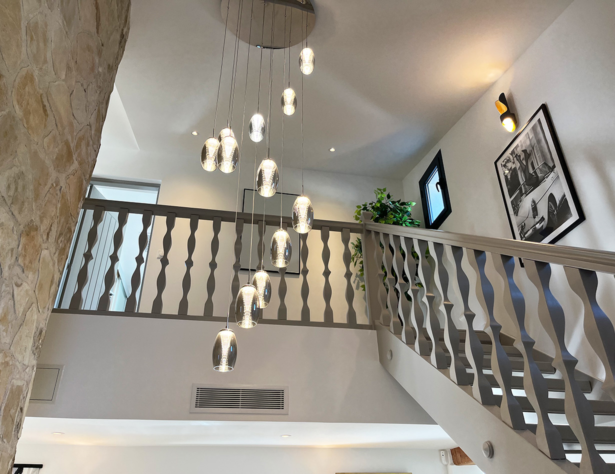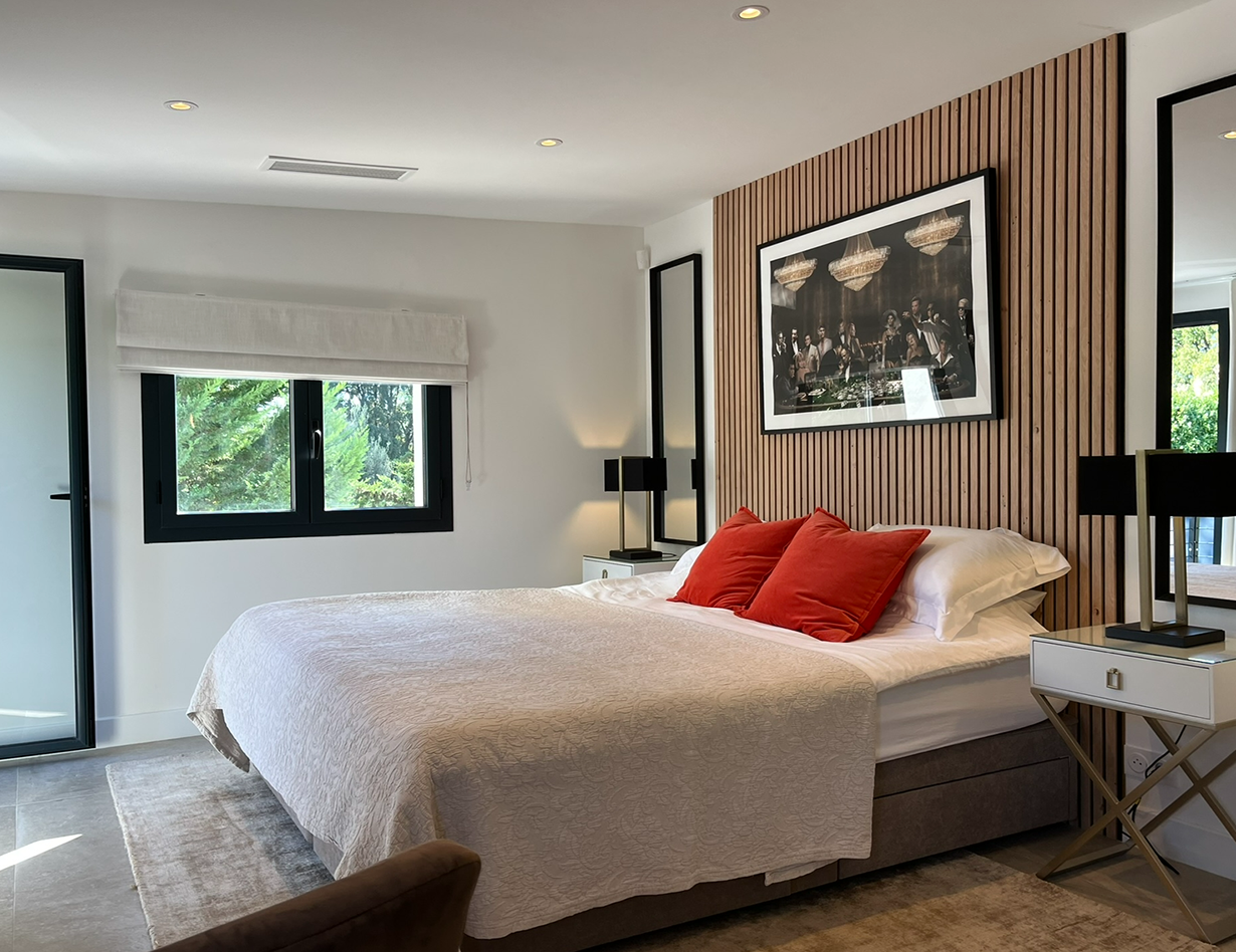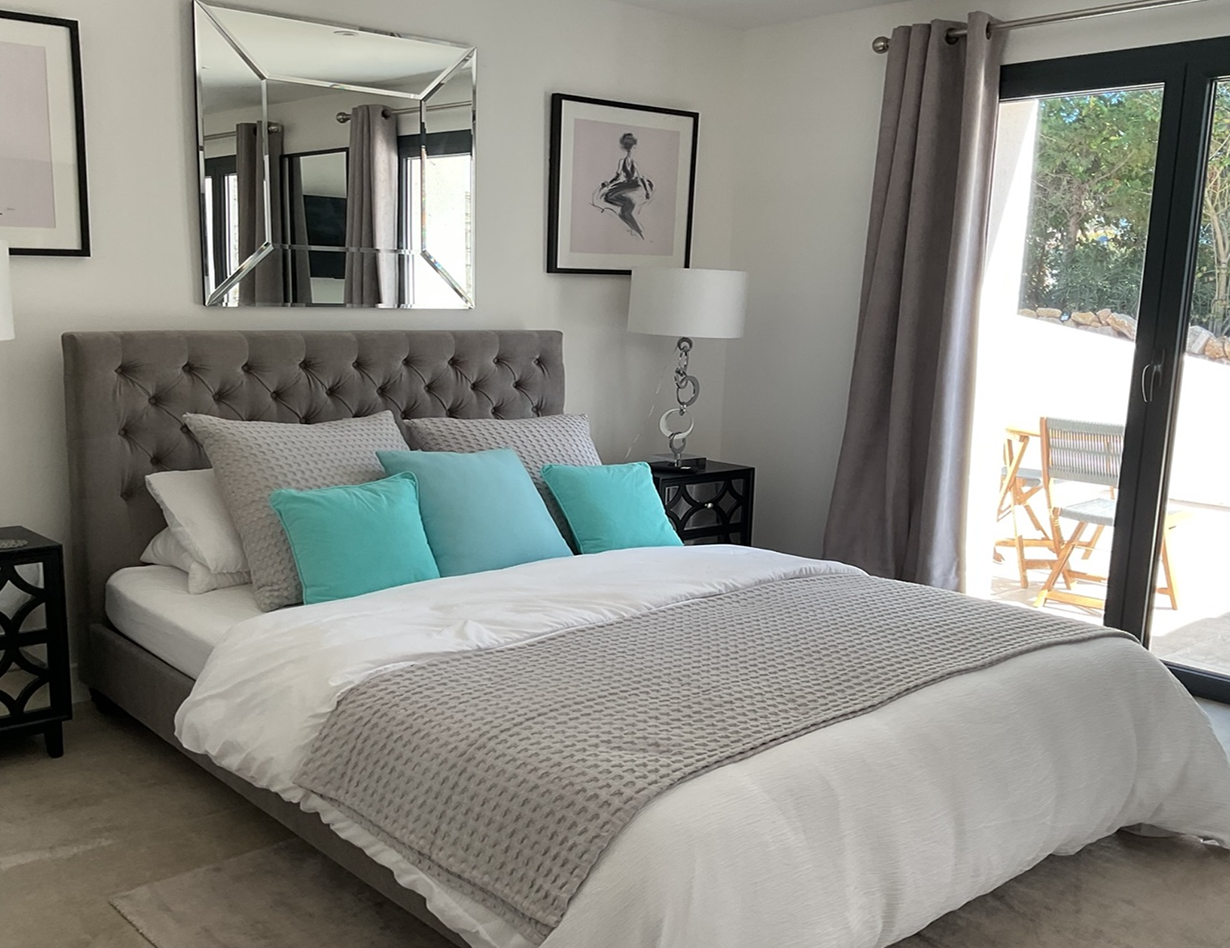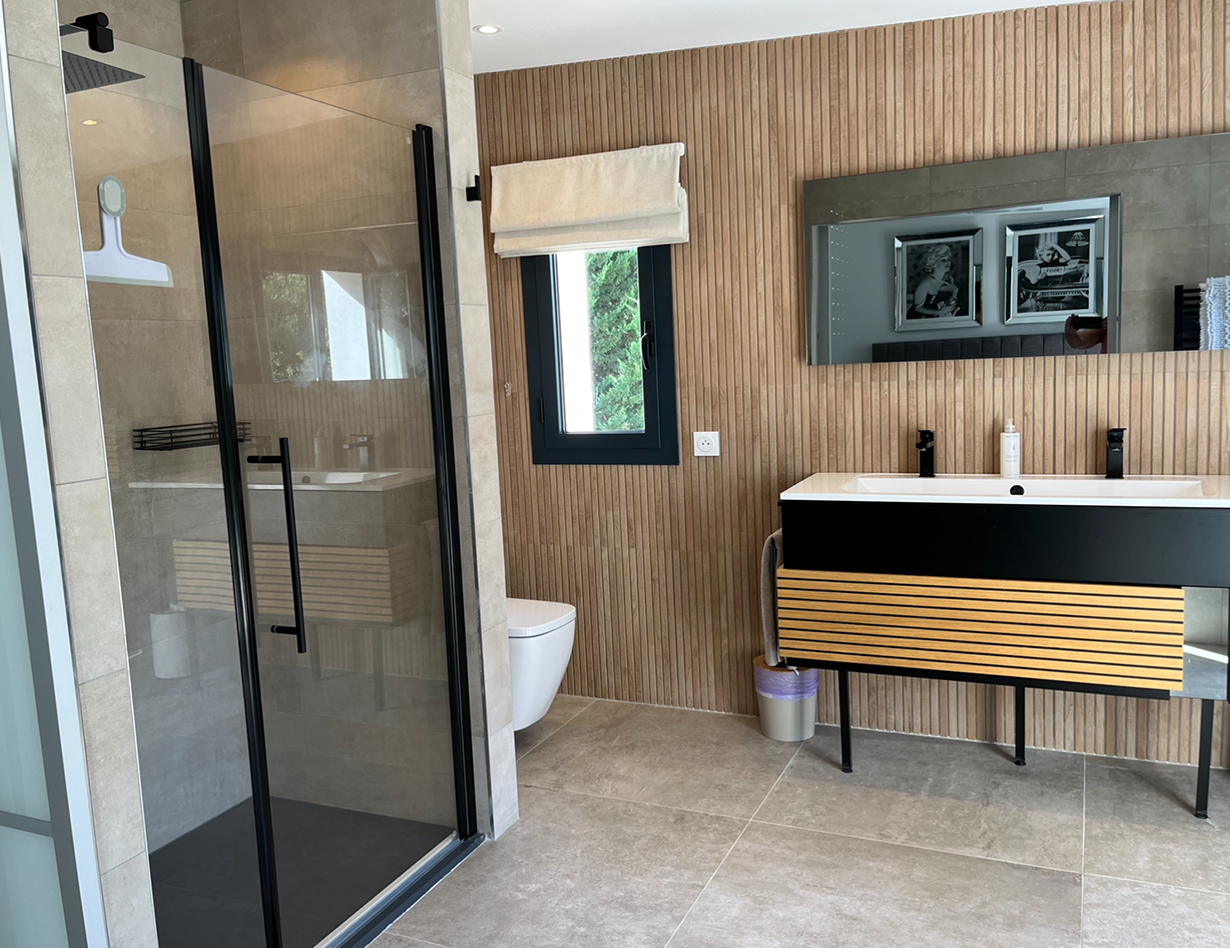 The fully air-conditioned villa offers four spacious double bedrooms, each with a luxurious ensuite bathroom and WC – perfect for families or friends looking to relax together. On the pool level, you’ll find an open-plan, elegantly designed living and dining area with a modern, fully equipped kitchen including a breakfast bar. Floor-to-ceiling sliding doors open onto the large sun terrace and flat garden, offering plenty of space for playing and unwinding.