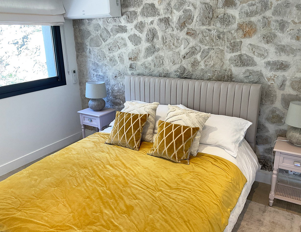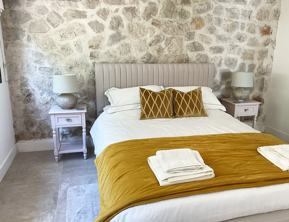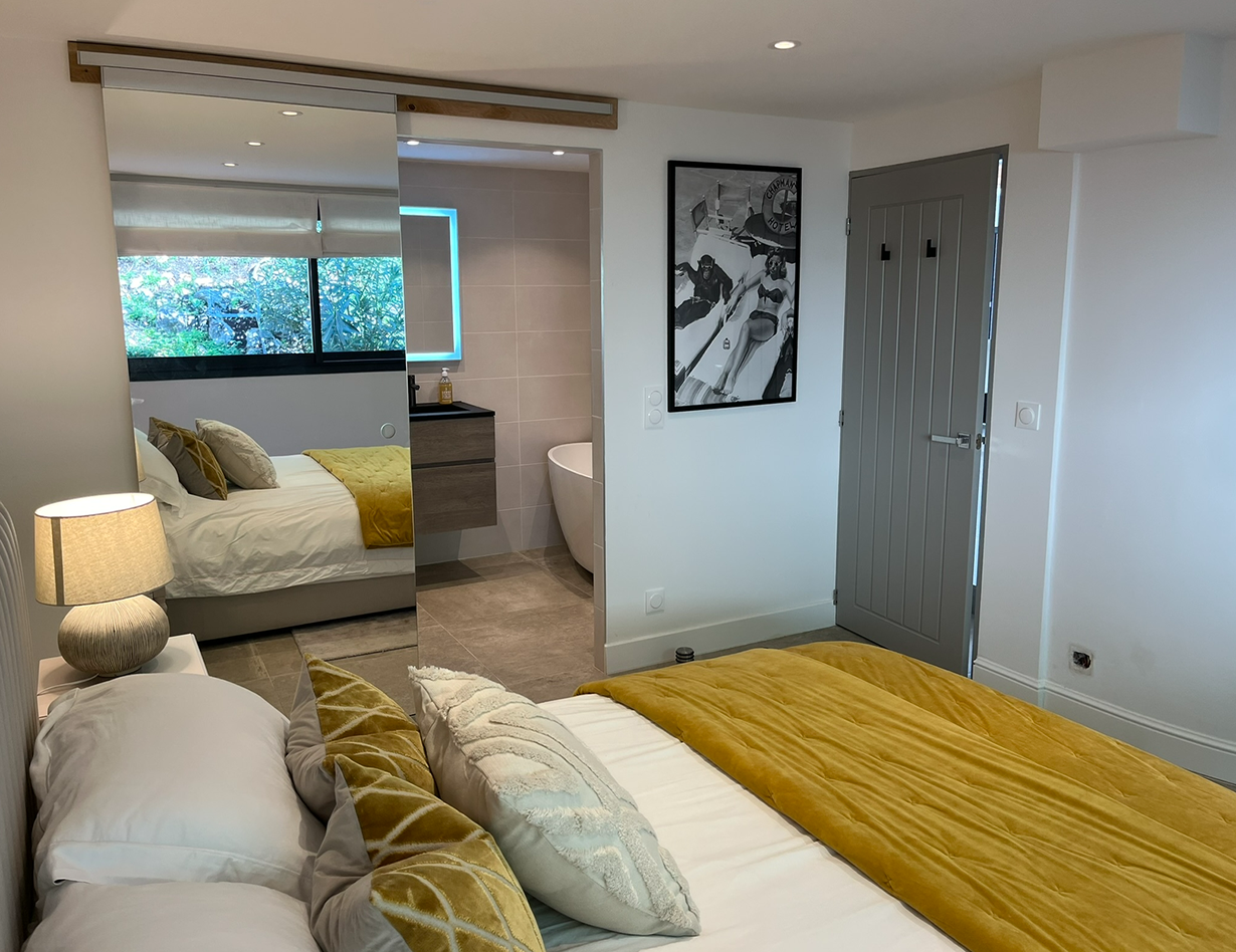 - Bedroom 1: Pool level, double room with large double bed, ensuite bathroom, WC.