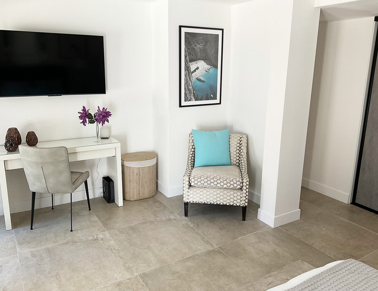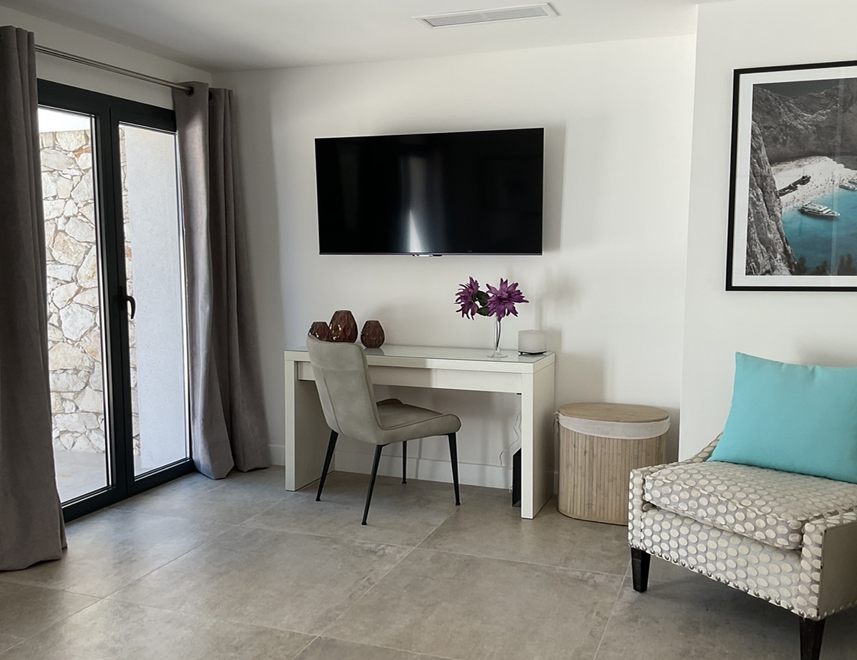 - Bedroom 3: 1st floor, large double room with terrace and pool view, ensuite bathroom/WC.