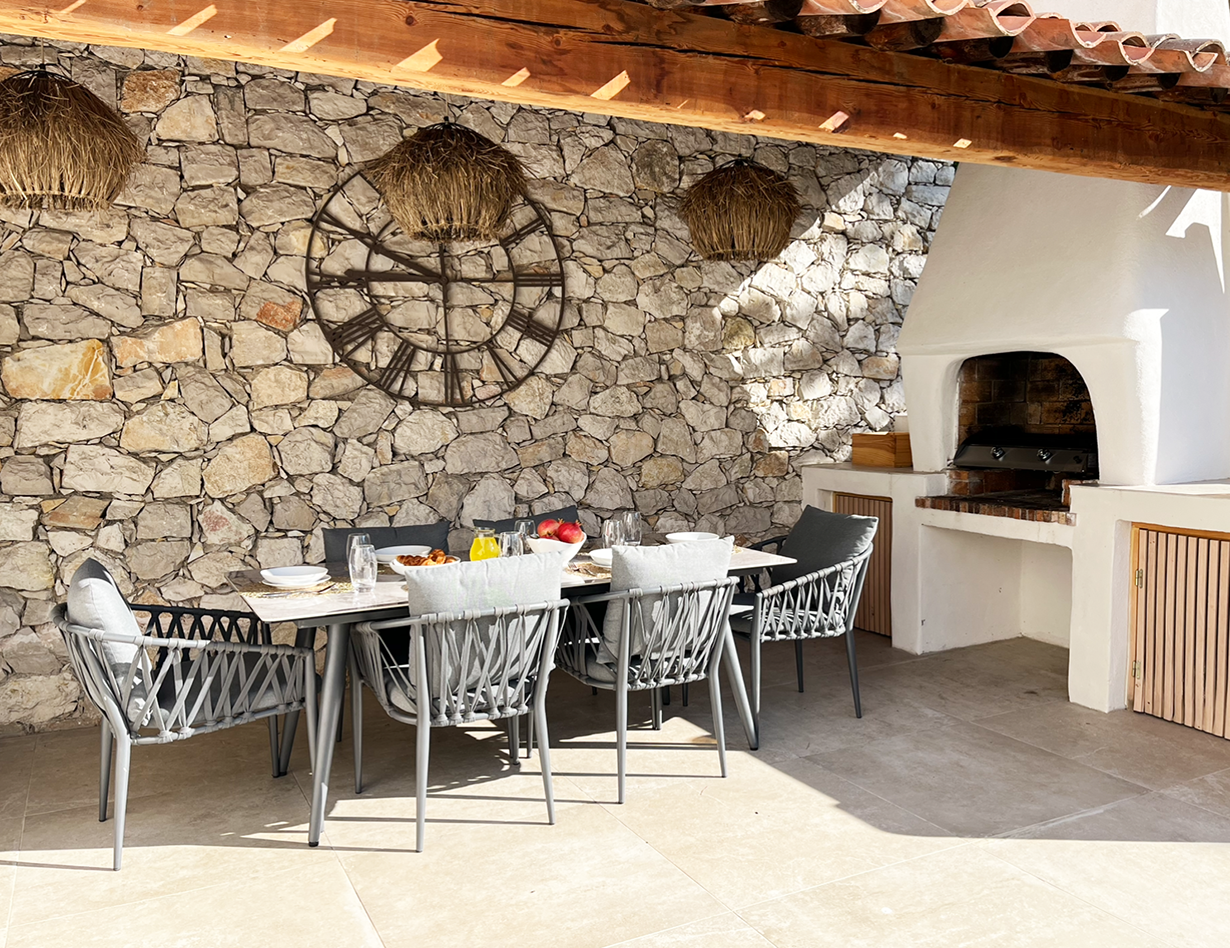 - Large terrace in front of the house with a great covered terrace, dining table by the BBQ, cozy lounge furniture, and several lounge corners.