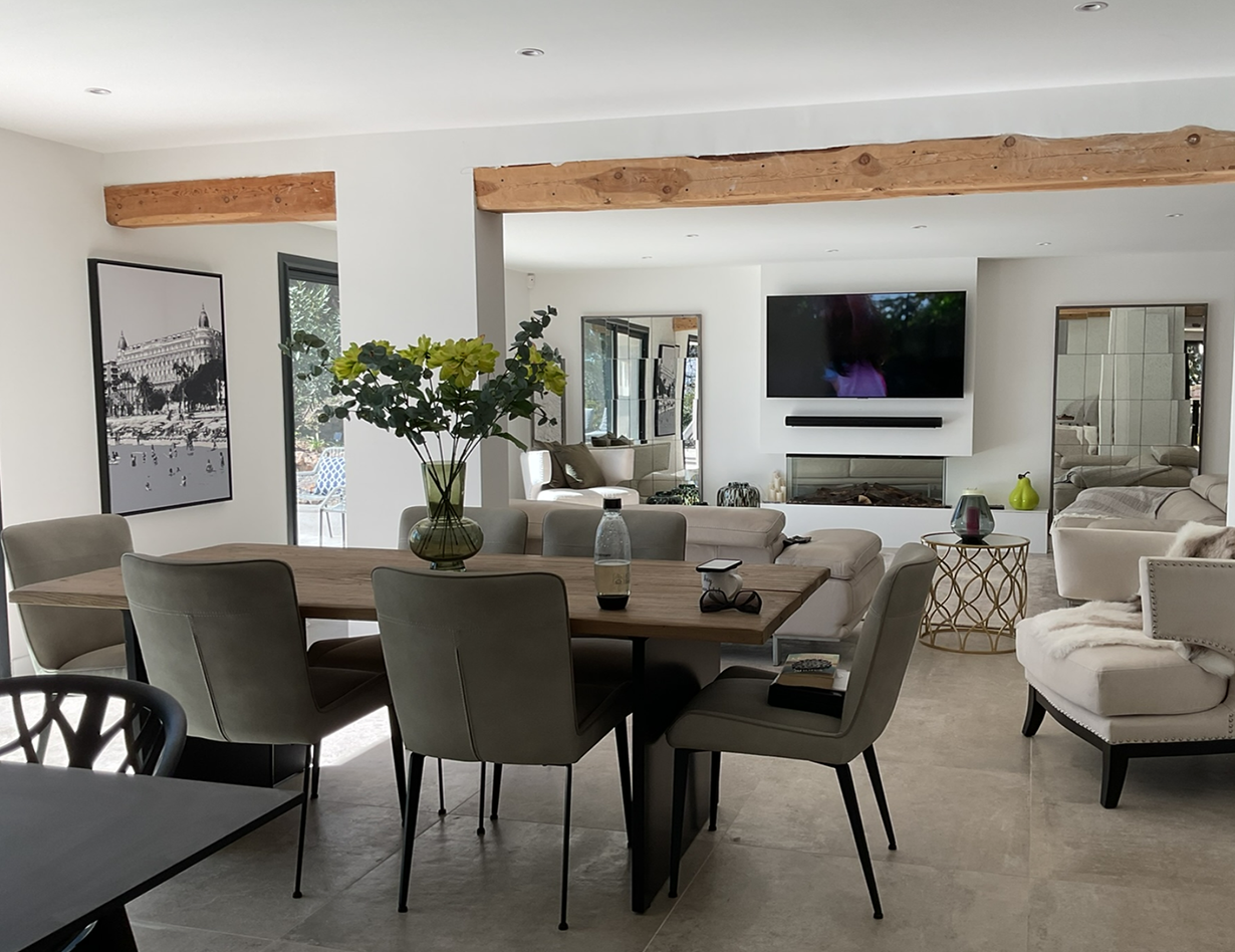 - Beautiful, modern, bright open-plan living area with access through large terrace doors to the garden and pool: indoor and outdoor living in one!