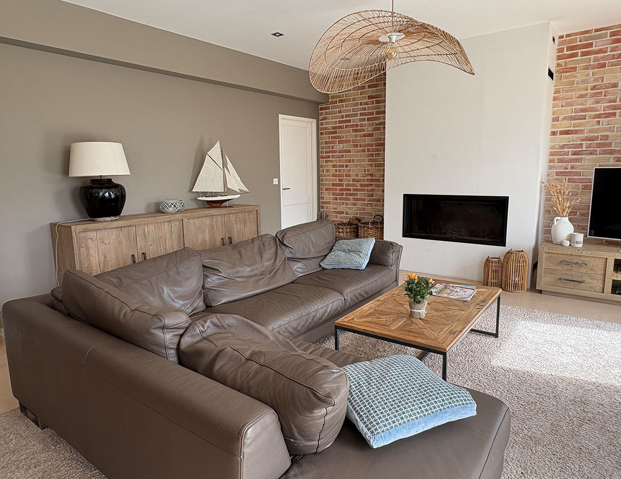 Luminöser komfortabler offener Wohnbereich mit großem Sofa, TV und großem Eßtisch. Austritt zu den Terrassen