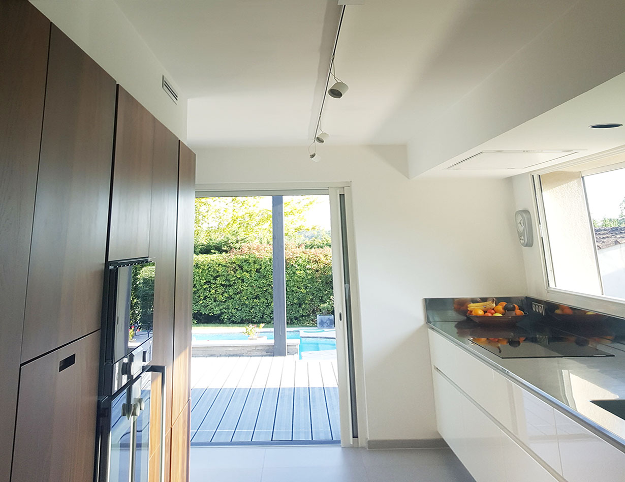 Große voll ausgestattete coole Designer-Küche BOFFI  mit allem, was man braucht, Geräte Gaggennau – ein vergnügen für Kochfans. Kaffeemaschine Nespresso