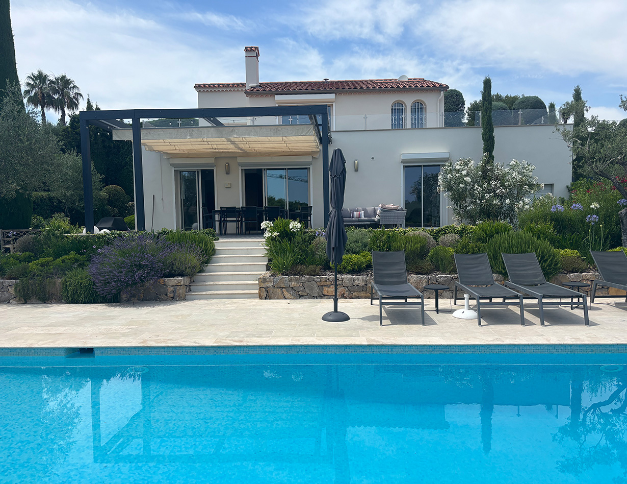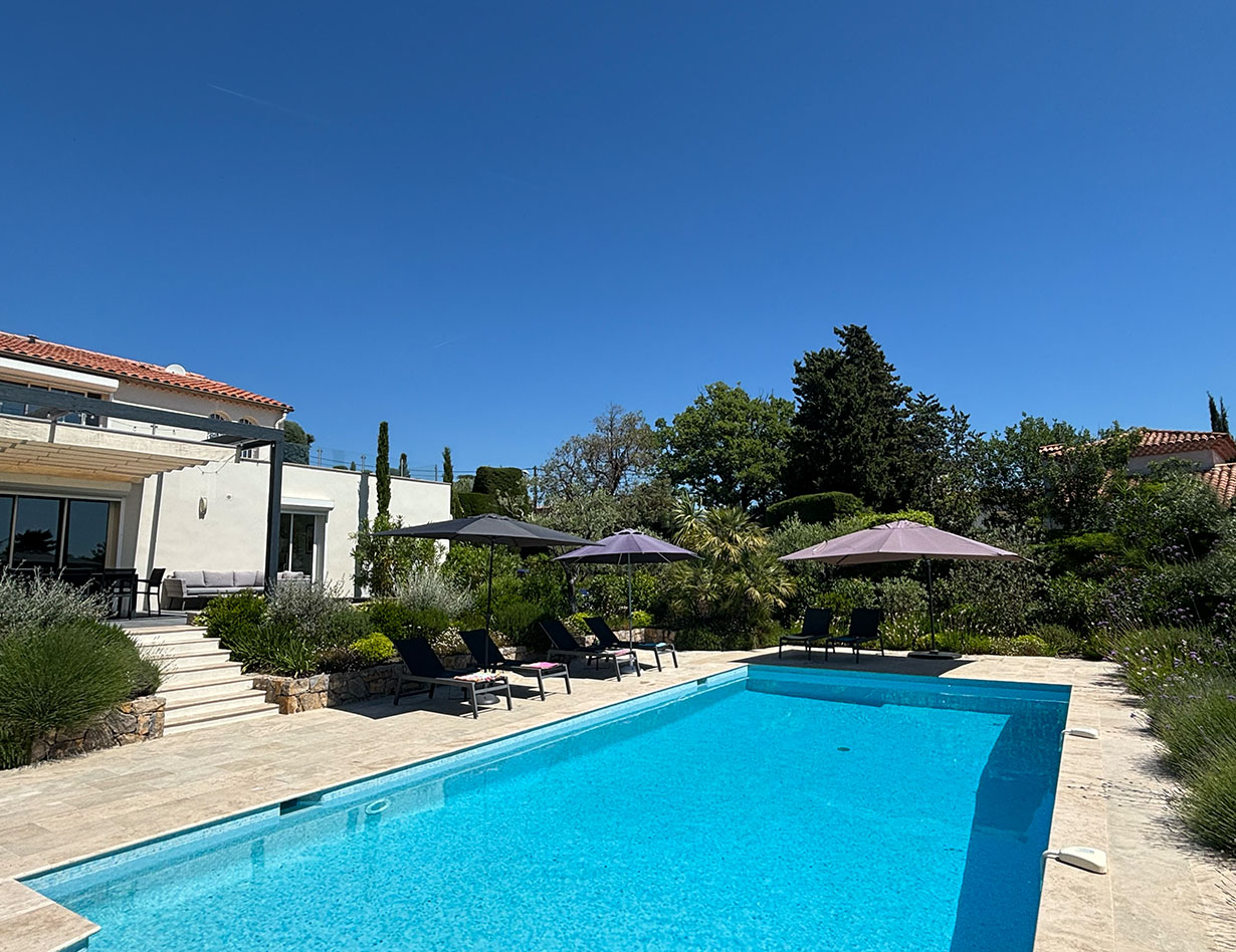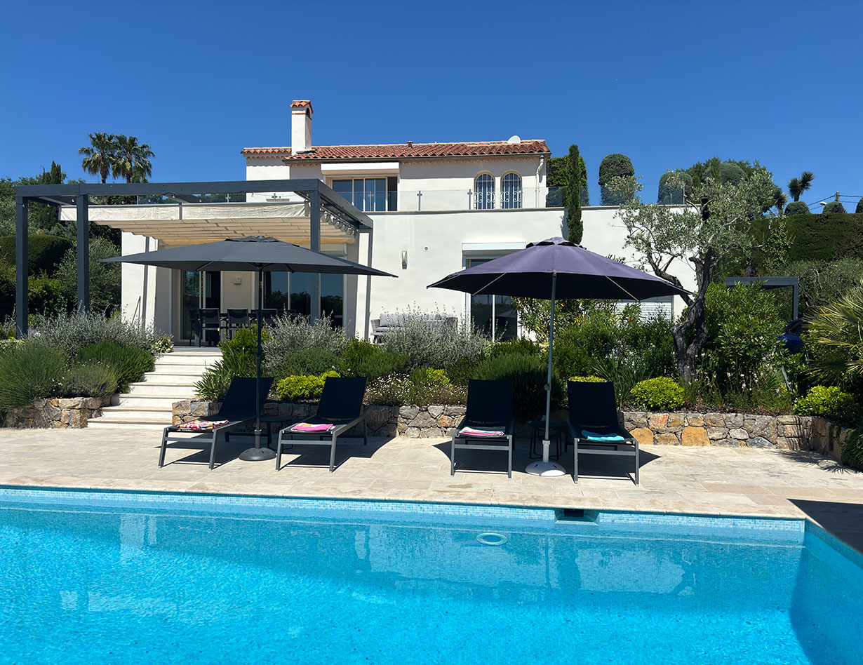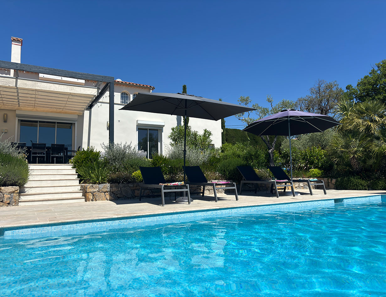 Das sehr gepflegte komfortable Ferienhaus liegt in exklusiver, ruhiger Wohngegend fußläufig zu Valbonne und besticht durch einen einzigartigen Garten mit vielen Terrassen, Entspannungsmöglichkeiten und ausgiebig Platz zum Spielen. Selbstverständlich überzeugt die Villa aber nicht nur durch ihren großartigen Außenbereich, sondern auch durch ihre inneren Werte. Im Erdgeschoss befinden sich neben einer hervorragend ausgestatten exklusiven Designerküche von Boffi und einem großzügigen Wohn- und Essbereich auch das Masterschlafzimmer sowie ein schönes Badezimmer. Vier weitere komfortable, klimatisierte Schlafzimmer mit komfortablen Betten liegen im ersten OG. Genießen Sie den Tag auf der tollen Terrasse vor der Küche mit grißem Eßtisch und auch gemütlicher Loungeecke, sowie einem Weber BBQ.  ! Wer eine Abkühlung benötigt, kann entweder einen Ausflug ans nahgelegene Meer machen oder springt einfach in den extragroßen Pool – sensationell. Neben dem Pool befindet sich ein exklusives Poolhouse mit Bad, WC.