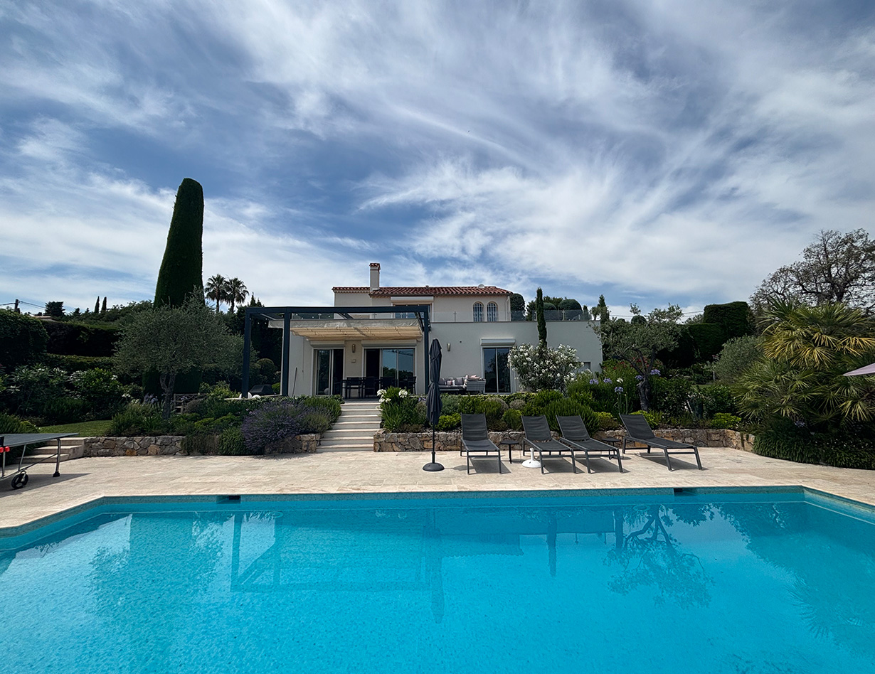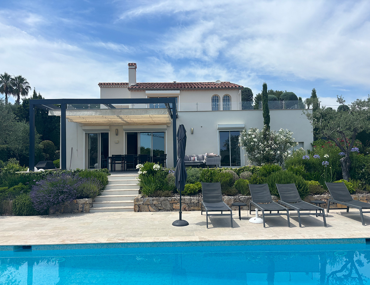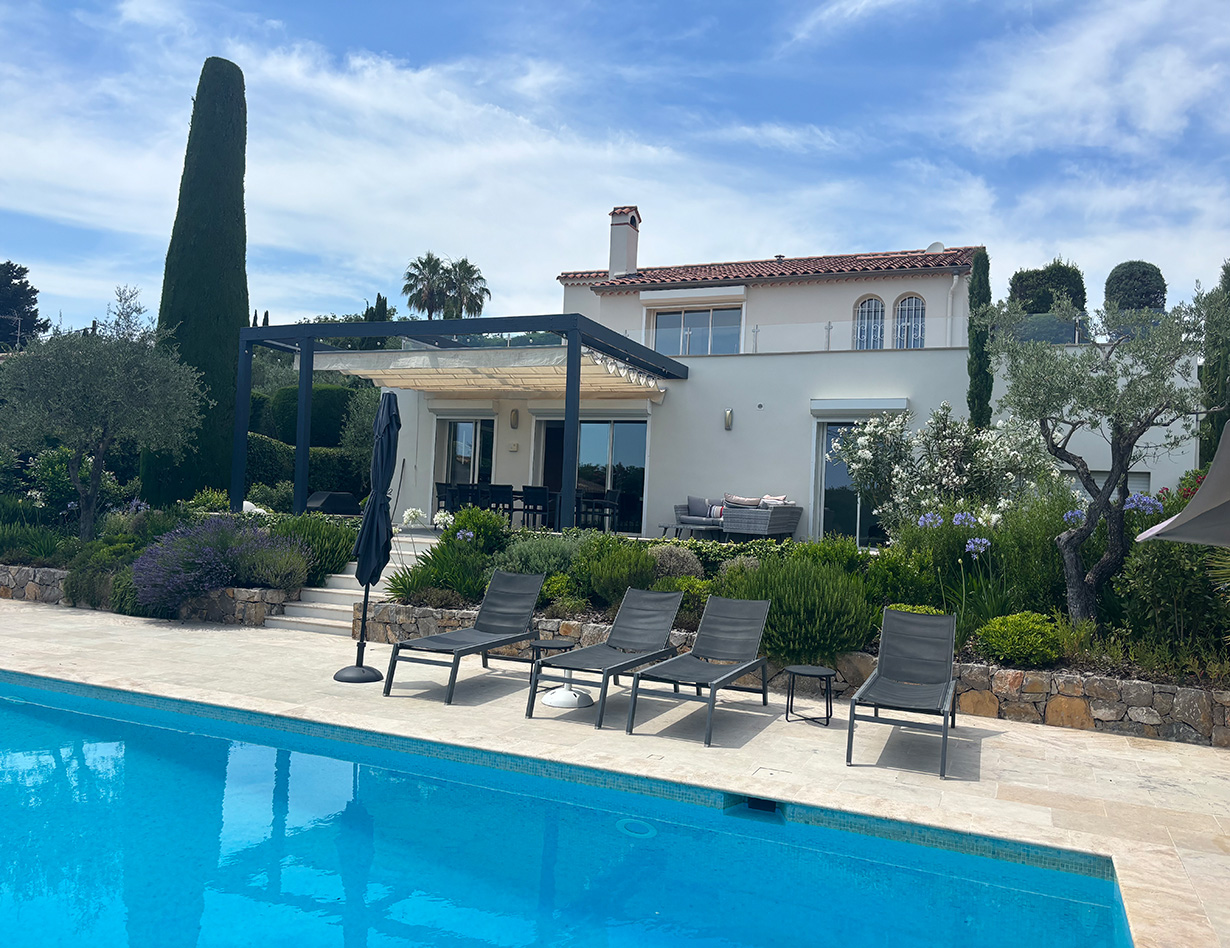 Das sehr gepflegte komfortable Ferienhaus liegt in exklusiver, ruhiger Wohngegend fußläufig zu Valbonne und besticht durch einen einzigartigen Garten mit vielen Terrassen, Entspannungsmöglichkeiten und ausgiebig Platz zum Spielen. Selbstverständlich überzeugt die Villa aber nicht nur durch ihren großartigen Außenbereich, sondern auch durch ihre inneren Werte. Im Erdgeschoss befinden sich neben einer hervorragend ausgestatten exklusiven Designerküche von Boffi und einem großzügigen Wohn- und Essbereich auch das Masterschlafzimmer sowie ein schönes Badezimmer. Vier weitere komfortable, klimatisierte Schlafzimmer mit komfortablen Betten liegen im ersten OG. Genießen Sie den Tag auf der tollen Terrasse vor der Küche mit grißem Eßtisch und auch gemütlicher Loungeecke, sowie einem Weber BBQ.  ! Wer eine Abkühlung benötigt, kann entweder einen Ausflug ans nahgelegene Meer machen oder springt einfach in den extragroßen Pool – sensationell. Neben dem Pool befindet sich ein exklusives Poolhouse mit Bad, WC.