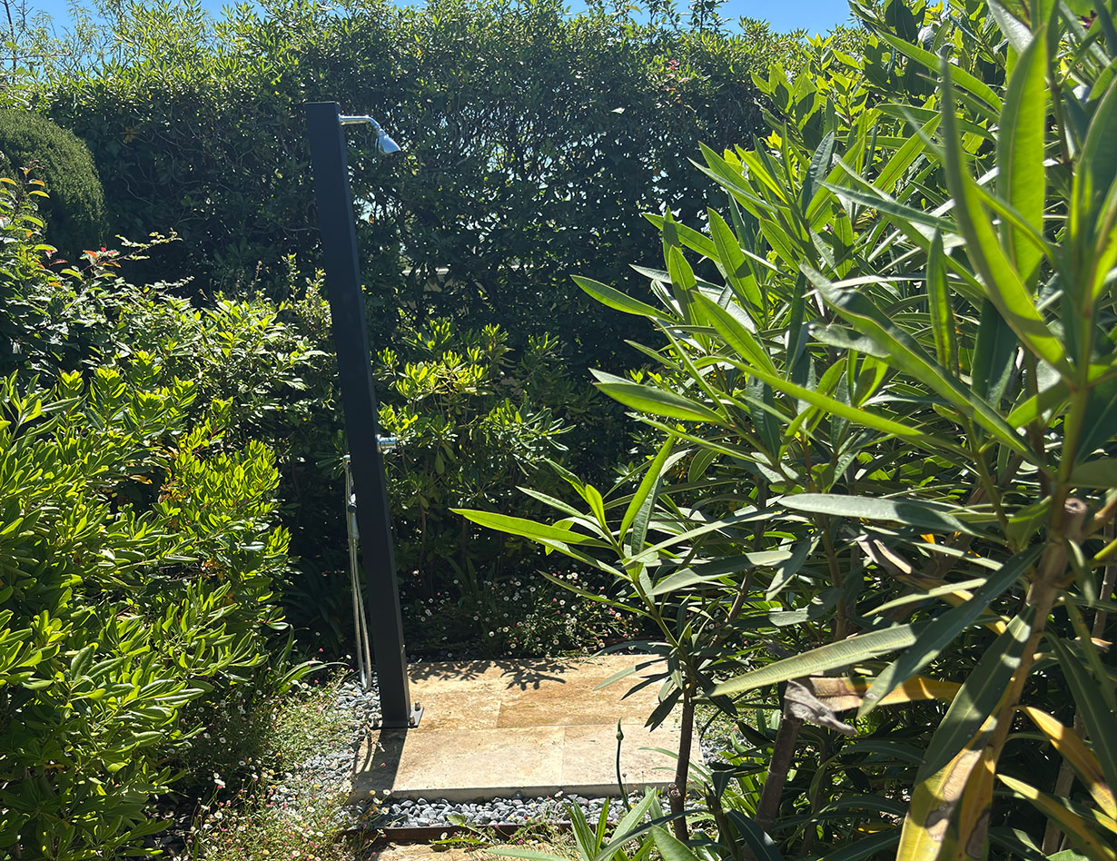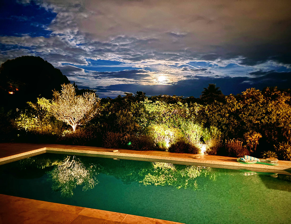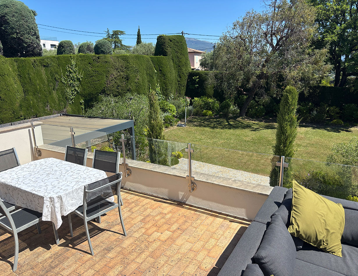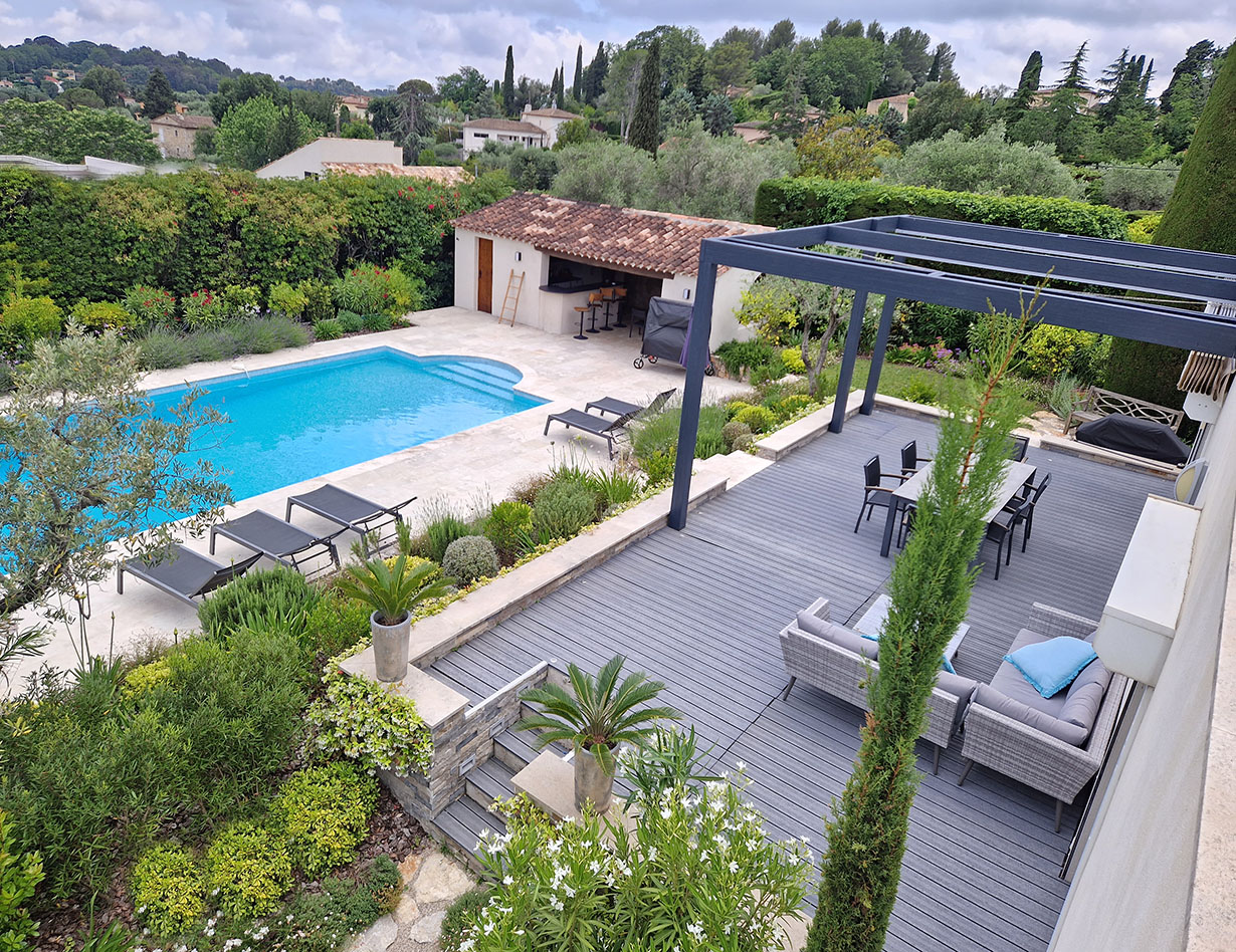 Das sehr gepflegte komfortable Ferienhaus liegt in exklusiver, ruhiger Wohngegend fußläufig zu Valbonne und besticht durch einen einzigartigen Garten mit vielen Terrassen, Entspannungsmöglichkeiten und ausgiebig Platz zum Spielen. Selbstverständlich überzeugt die Villa aber nicht nur durch ihren großartigen Außenbereich, sondern auch durch ihre inneren Werte. Im Erdgeschoss befinden sich neben einer hervorragend ausgestatten exklusiven Designerküche von Boffi und einem großzügigen Wohn- und Essbereich auch das Masterschlafzimmer sowie ein schönes Badezimmer. Vier weitere komfortable, klimatisierte Schlafzimmer mit komfortablen Betten liegen im ersten OG. Genießen Sie den Tag auf der tollen Terrasse vor der Küche mit grißem Eßtisch und auch gemütlicher Loungeecke, sowie einem Weber BBQ.  ! Wer eine Abkühlung benötigt, kann entweder einen Ausflug ans nahgelegene Meer machen oder springt einfach in den extragroßen Pool – sensationell. Neben dem Pool befindet sich ein exklusives Poolhouse mit Bad, WC.