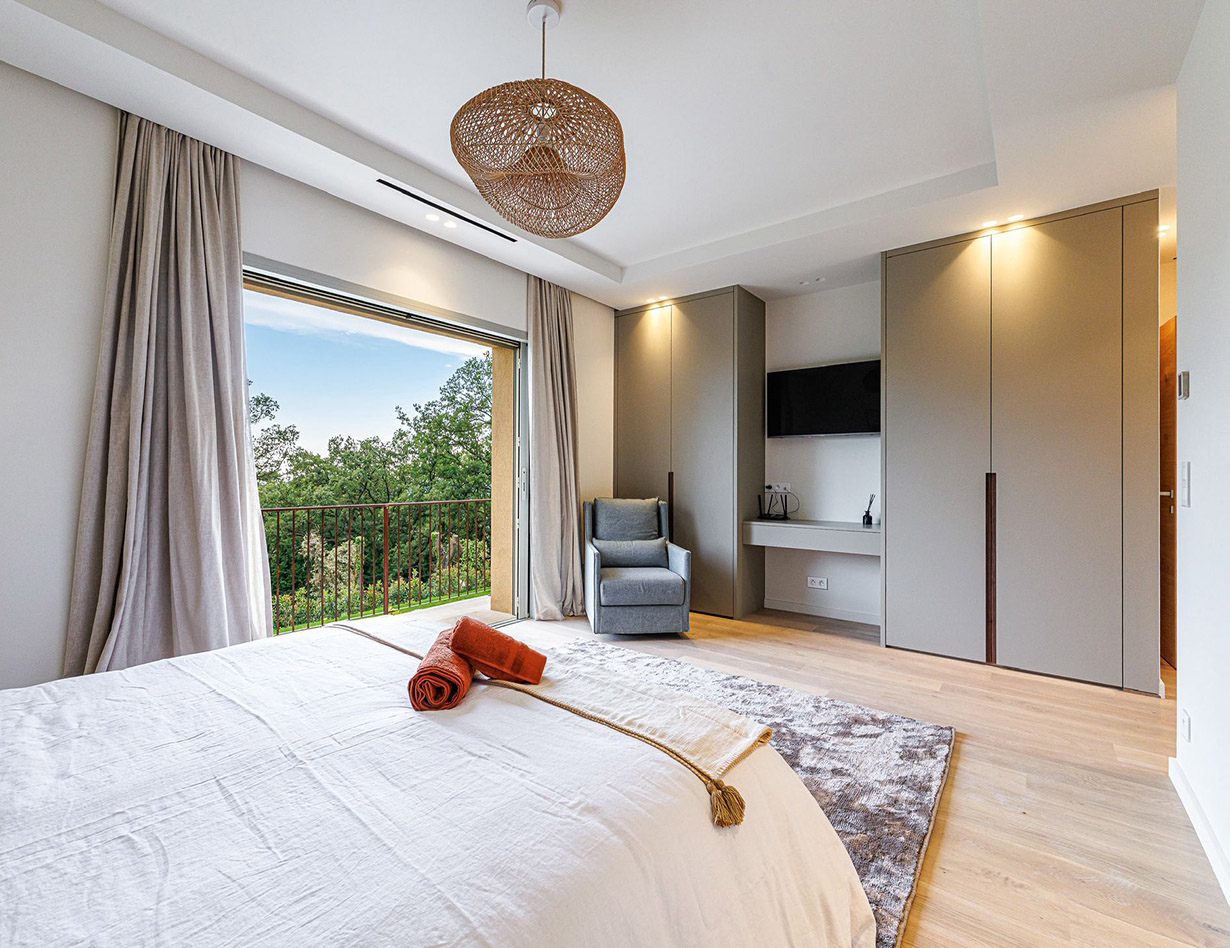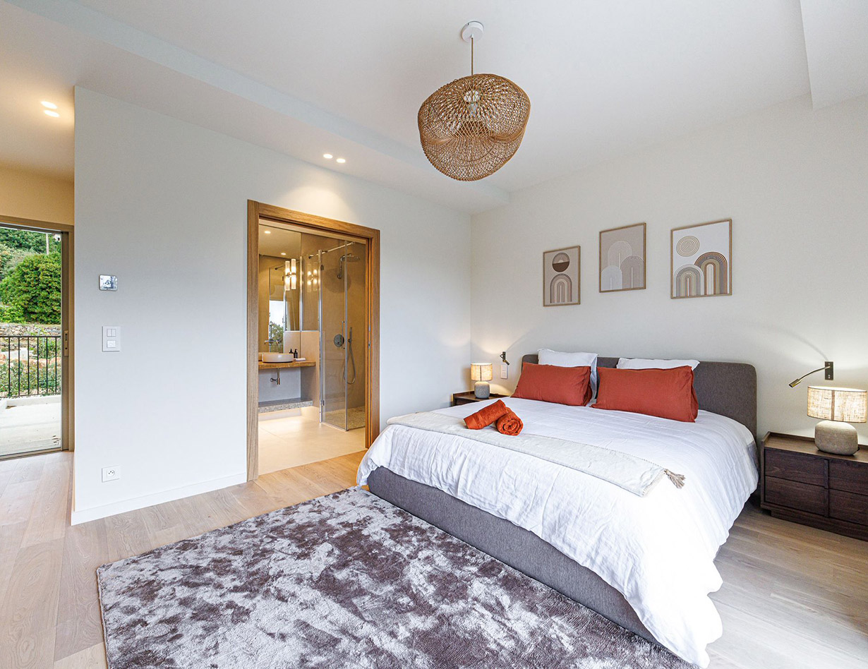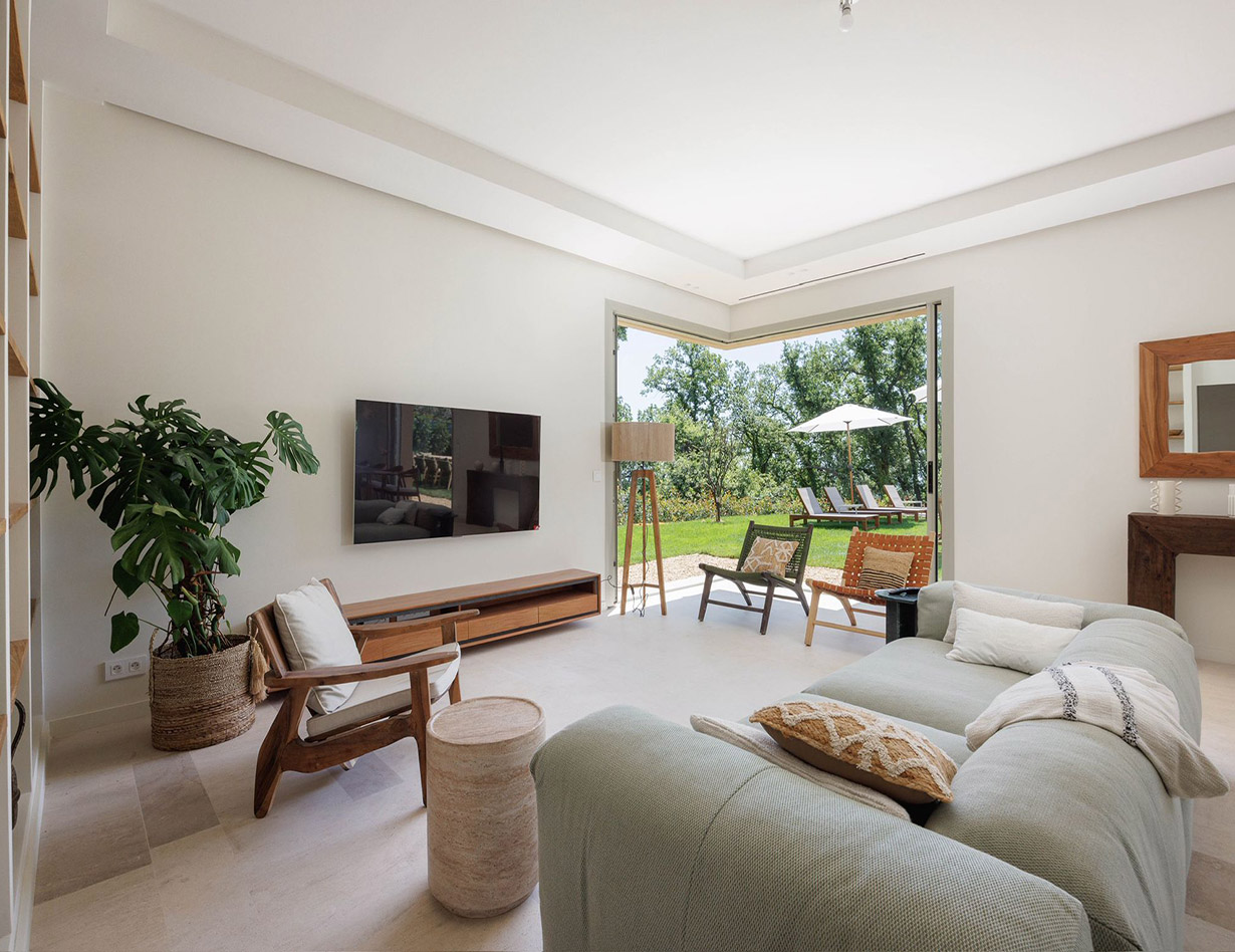 Jedes der vier Schlafzimmer verfügt über ein eigenes, elegantes Bad – ideal für Familien oder befreundete Paare, die gemeinsam, aber mit Privatsphäre reisen möchten. Der lichtdurchflutete Wohnbereich öffnet sich zur sonnigen Terrasse und bietet einen wunderbaren Blick auf den mediterranen Garten.