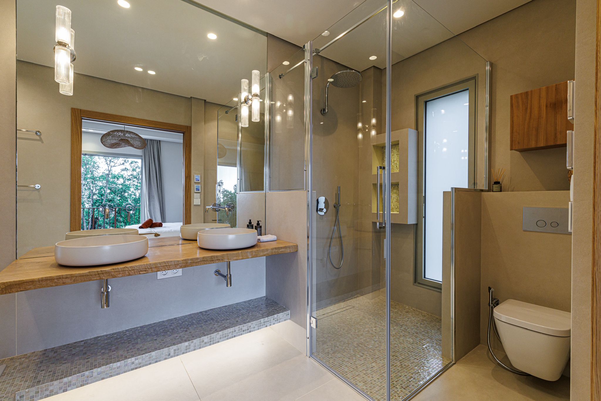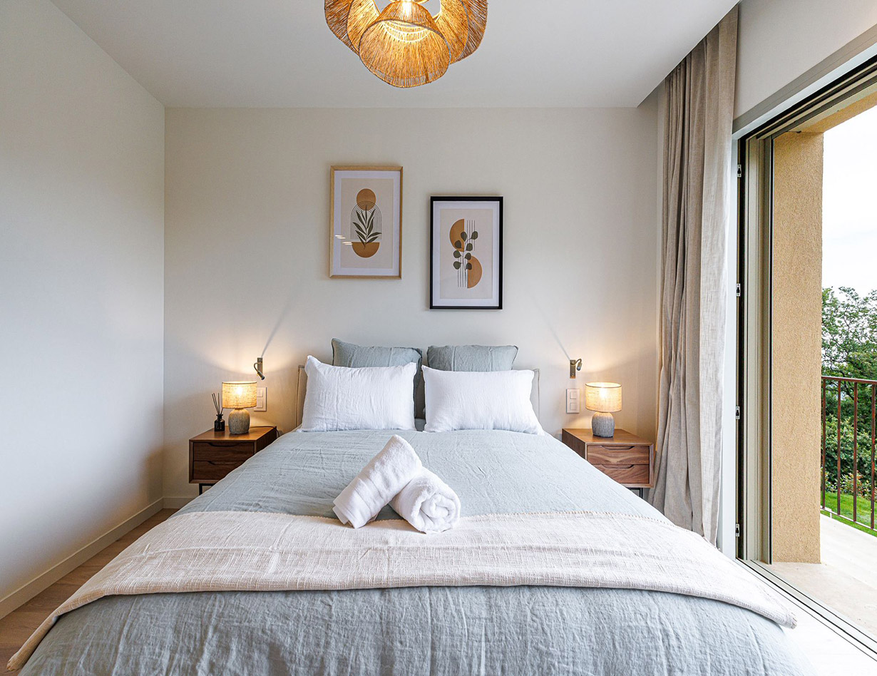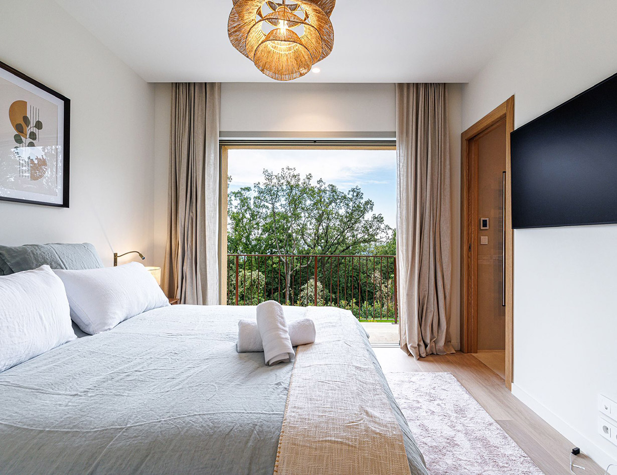 Jedes der vier Schlafzimmer verfügt über ein eigenes, elegantes Bad – ideal für Familien oder befreundete Paare, die gemeinsam, aber mit Privatsphäre reisen möchten. Der lichtdurchflutete Wohnbereich öffnet sich zur sonnigen Terrasse und bietet einen wunderbaren Blick auf den mediterranen Garten.